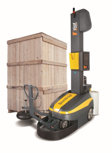 Robo Wrap 600 B to samojezdny robot owijający palety z systemem motorized pre-stretch folii w zakresie 230–300%. Robot działa autonomicznie wokół palet o różnych wymiarach i ciężarze. Wyposażony jest w sterownik PLC i ekran dotykowy 7,2”, który umożliwia intuicyjną konfigurację parametrów cyklu. Urządzenie posiada akumulatorowe zasilanie oraz czujniki bezpieczeństwa z funkcją awaryjnego zatrzymania. Robo Wrap 600 B zapewnia wydajne i powtarzalne owijanie palet w magazynach i centrach logistycznych.