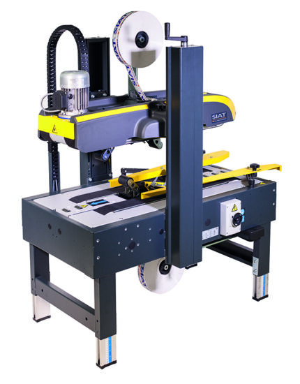 SIAT SK20 to półautomatyczna zaklejarka kartonów z podwójnymi górnymi i dolnymi pasami napędowymi oraz manualną regulacją szerokości i wysokości kartonu. Urządzenie zapewnia równomierne naklejanie taśmy klejącej na górnej i dolnej części pudeł, co przekłada się na stabilne i powtarzalne zamknięcie opakowań.