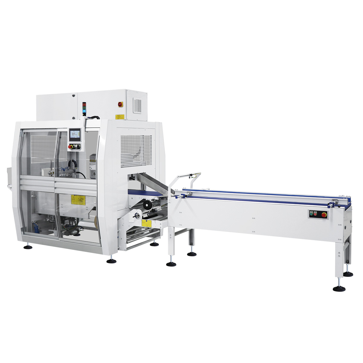 Maszyna wyposażona jest w zaawansowany panel sterowania z ekranem dotykowym, który umożliwia intuicyjne ustawianie parametrów pracy – takich jak prędkość transportu, temperatura zgrzewania i długość cyklu pakowania. Panel sterowania pozwala również zapisać wiele programów pracy, co znacznie skraca czas przezbrajania przy zmianie formatu pakowanych produktów.