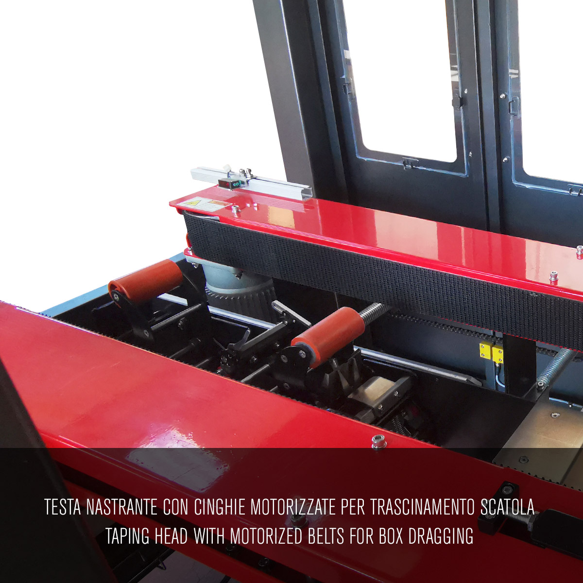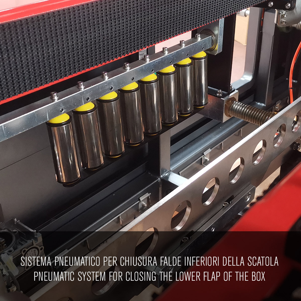 Transport kartonów przez poszczególne strefy pracy realizowany jest poprzez napęd elektropneumatyczny zsynchronizowany z mechanizmami formującymi i zaklejającymi. System napędowy prowadzi opakowanie stabilnie przez wszystkie etapy, co minimalizuje ryzyko przesunięcia klap lub błędów w procesie zamykania opakowania. Dzięki temu każdorazowo uzyskuje się powtarzalne i wysokiej jakości przygotowanie kartonu do dalszych operacji pakowania lub transportu.