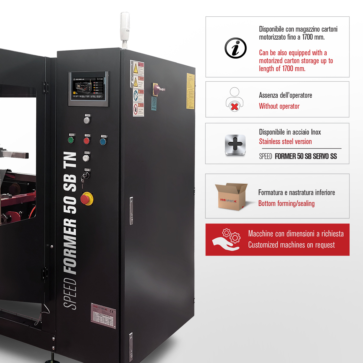 Automatyczna formierka Speed Former 50 SB TN to urządzenie pakujące do formowania dna i dolnego zaklejania kartonów klapowych typu amerykańskiego.