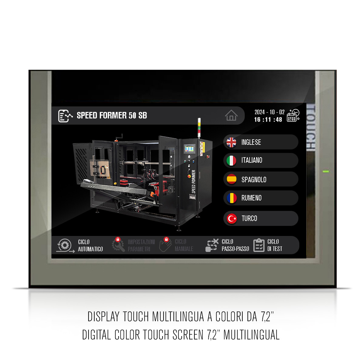 Speed Former 50 SB TN jest sterowana centralnie za pomocą panelu PLC, który umożliwia precyzyjne zarządzanie pracą maszyny. Panel sterowania pozwala na ustawienie podstawowych parametrów procesu, monitorowanie stanu pracy oraz kontrolę sygnalizacji błędów lub stanów awaryjnych. Dzięki centralnemu sterowaniu operator ma możliwość szybkiej konfiguracji urządzenia pod dany format kartonów, a panel PLC zapewnia stabilność i powtarzalność sekwencji pracy na kolejnych opakowaniach.