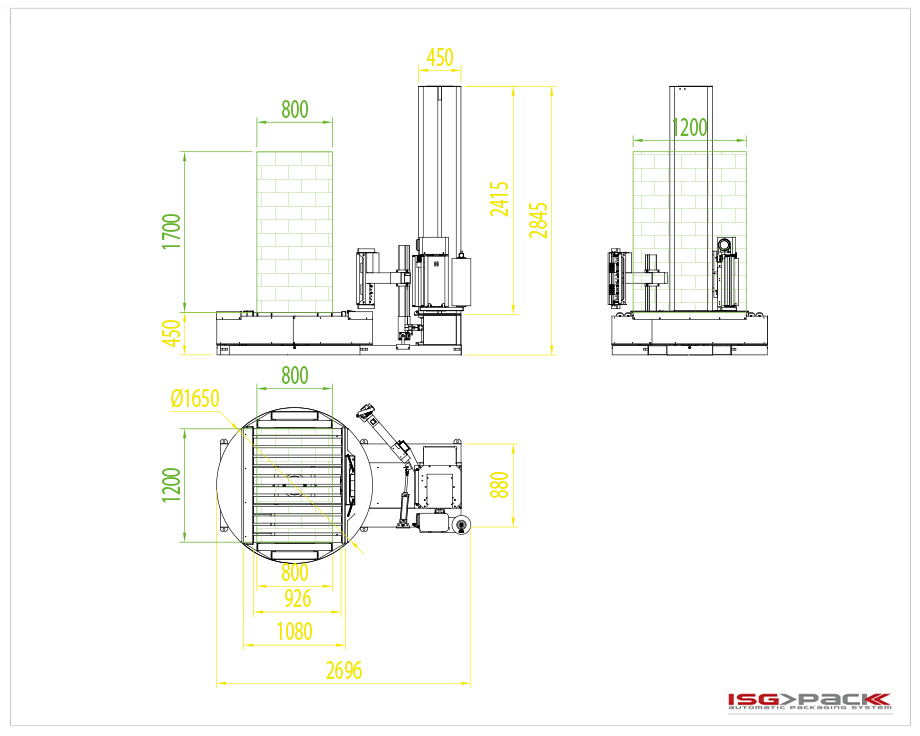Maszyna posiada stalową konstrukcję malowaną proszkowo. Rotacja palety odbywa się na talerzu Ø 2000 mm, a wózek folii napędzany jest przekładnią łańcuchową. Pneumatyczny system zgrzewania folii oraz automatyczne cięcie zapewniają trwałe i estetyczne wykończenie każdej palety. Pre-stretch folii wynosi 200% z możliwością ustawienia 100%, 150% lub 250%.