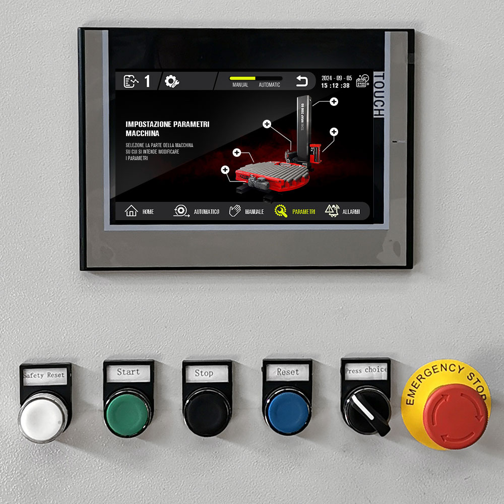 Panel dotykowy ułatwia obsługę, a systemy bezpieczeństwa, w tym fotokomórki, wyłączniki awaryjne i alarmy świetlne i akustyczne, zapewniają zgodność z normami CE i chronią operatora. Konstrukcja umożliwia łatwy dostęp do punktów serwisowych.