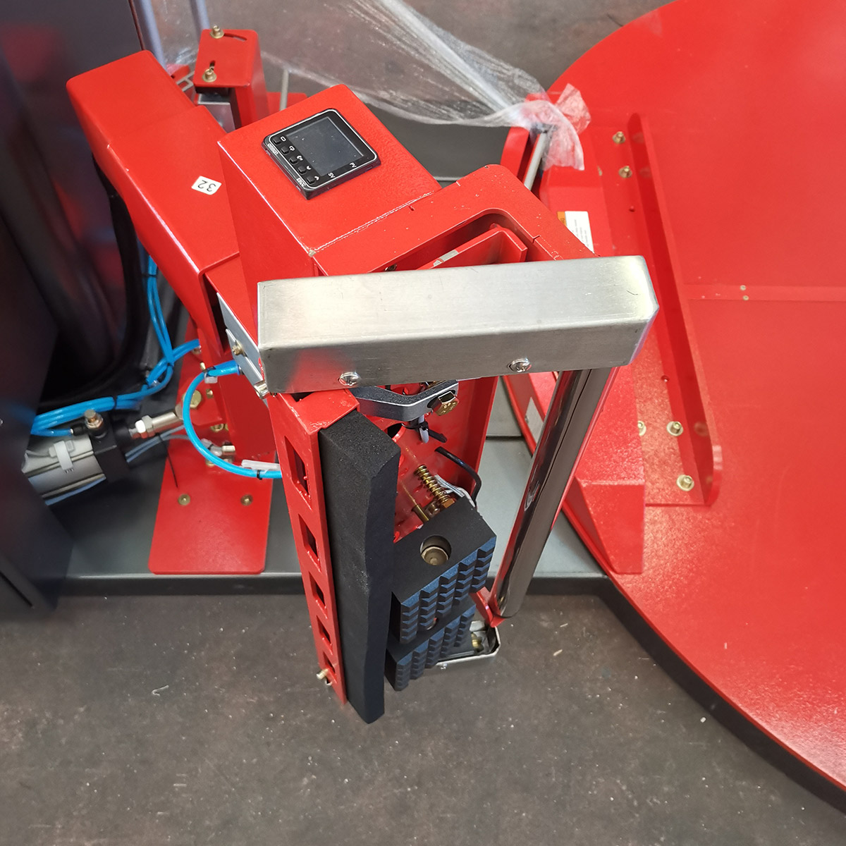 Owijarka posiada stalową konstrukcję malowaną proszkowo, talerz obrotowy o średnicy 1650 mm oraz wózek z folią napędzany łańcuchowo. System przycinania i zgrzewania folii, sterowany kontrolerem temperatury, zapewnia estetyczne i trwałe wykończenie cyklu. Urządzenie wyposażono w funkcję pre-stretch folii 200% z możliwością zmiany przełożeń na 100%, 150% i 250%. Cykl można uruchamiać za pomocą pilota radiowego lub panelu dotykowego.