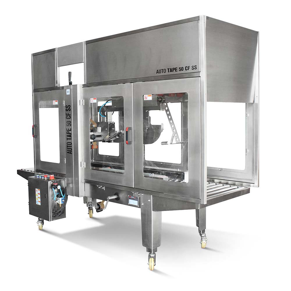 Automatyczna zaklejarka Auto Tape 50 CF SS to stalowa maszyna pakująca do automatycznego zaklejania górnej i dolnej części kartonów klapowych taśmą samoprzylepną.
