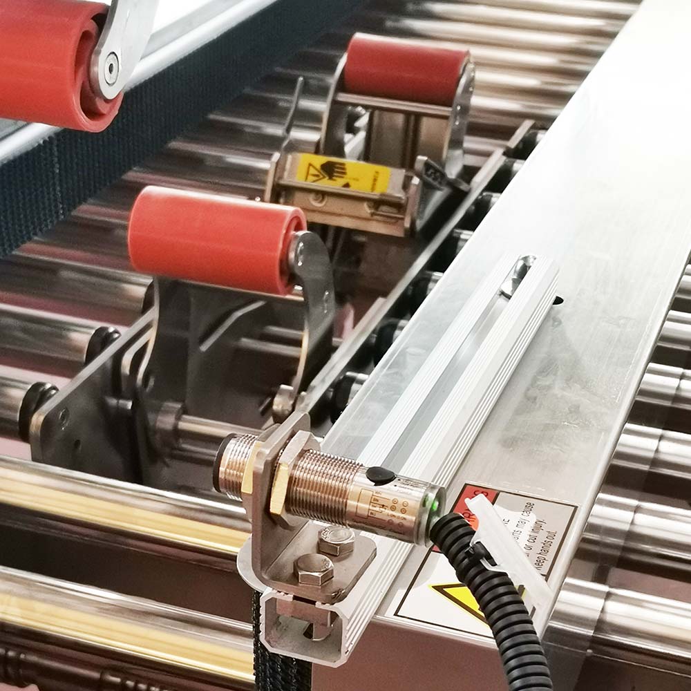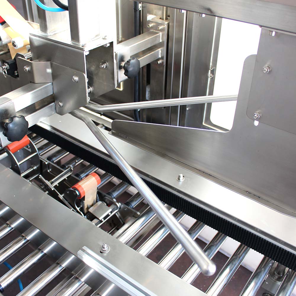 Rolkowe przenośniki wejściowe i wyjściowe ułatwiają podawanie oraz odbiór kartonów, zapewniając płynny transfer opakowań przez strefę zaklejania. Taki sposób transportu redukuje ryzyko blokowania się kartonów oraz usprawnia przepływ pracy w linii pakującej. Dodatkowo umożliwia łatwy dostęp do urządzenia w celu ustawienia formatu pracy oraz serwisowania poszczególnych elementów.