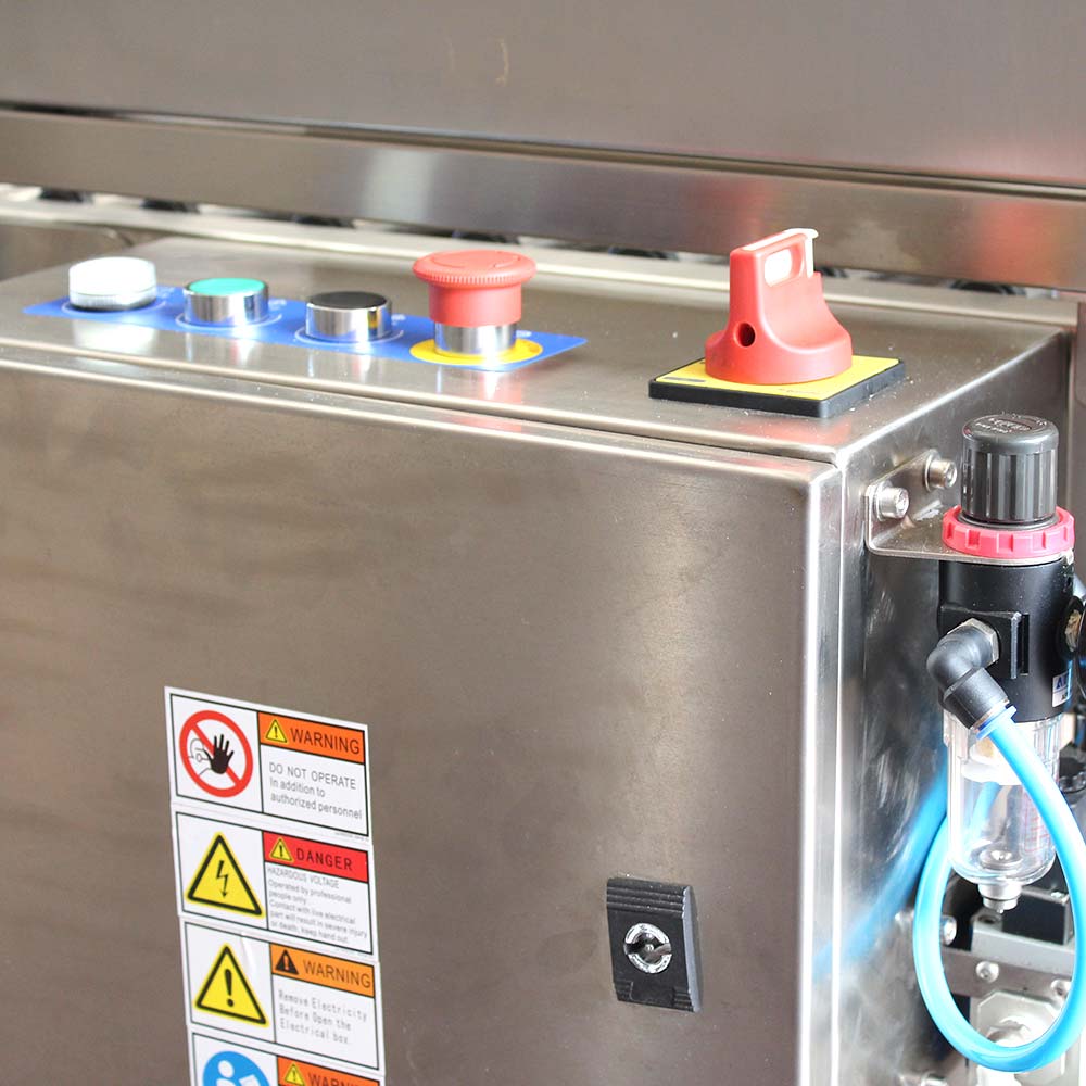 Maszyna wyposażona jest w panel sterowania z PLC, który umożliwia centralne zarządzanie funkcjami operacyjnymi oraz kontrolę stanu pracy. Auto Tape 50 CF SS posiada dedykowane czujniki wykrywania zerwania taśmy oraz końca taśmy, co pozwala utrzymać ciągłość pracy bez interwencji operatora. Panel PLC zarządza sygnałami czujników, co minimalizuje przerwy w cyklu pracy i poprawia stabilność działania.