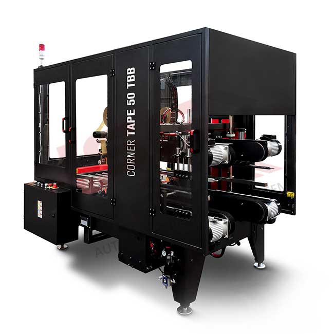 Automatyczna zaklejarka Corner Tape 50 TBB to maszyna pakująca zaprojektowana do zaklejania wszystkich czterech krawędzi kartonów klapowych przy użyciu taśmy samoprzylepnej.