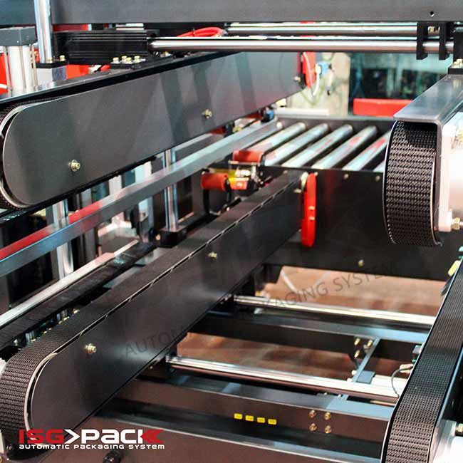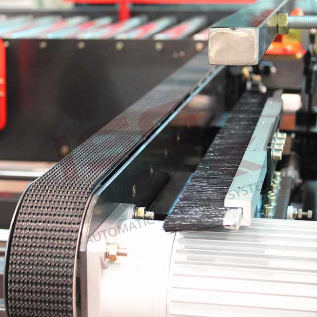 Maszyna została wyposażona w motorowe rolkowe przenośniki, które prowadzą karton w kierunku czujnika detekcyjnego uruchamiającego popychacz. Kiedy karton zostanie doprowadzony do strefy pracy, popychacz przekierowuje go pod kątem 90° względem osi wprowadzania, kierując w stronę czterech głowic tapujących. System napędu rolkowego zapewnia płynny i równomierny transfer opakowań, co jest podstawą do uzyskania stabilnej i powtarzalnej pracy zaklejarki.