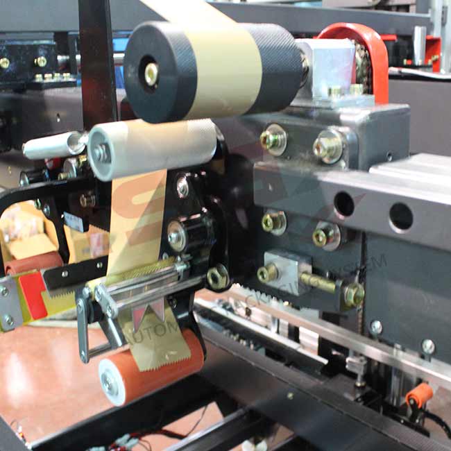 Urządzenie automatycznie prowadzi pudełko poprzez rolkowy przenośnik do strefy bocznego tapowania i nakłada cztery „U”-kształtne paski taśmy na górne i dolne krawędzie.