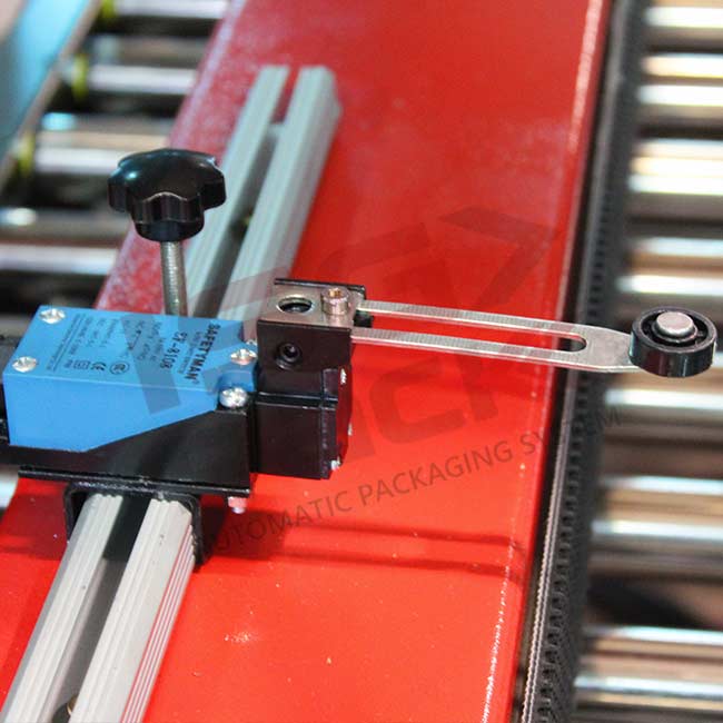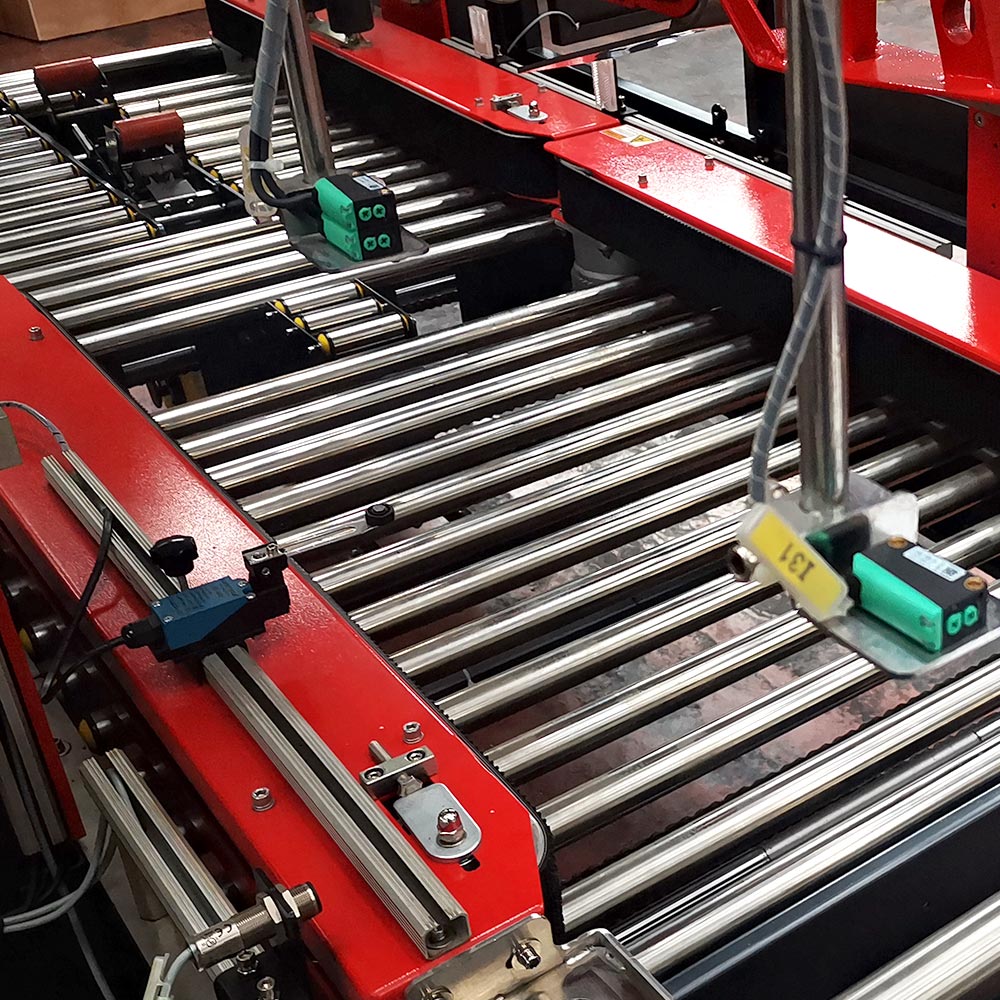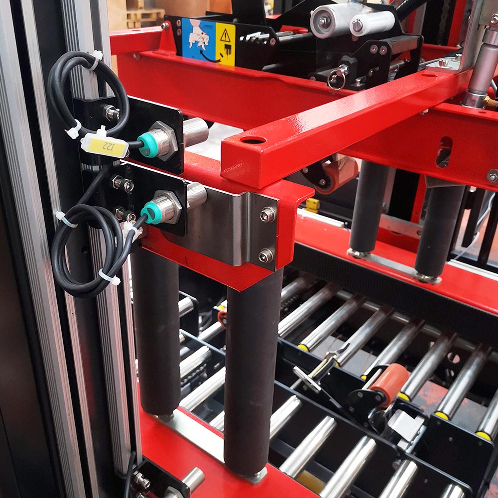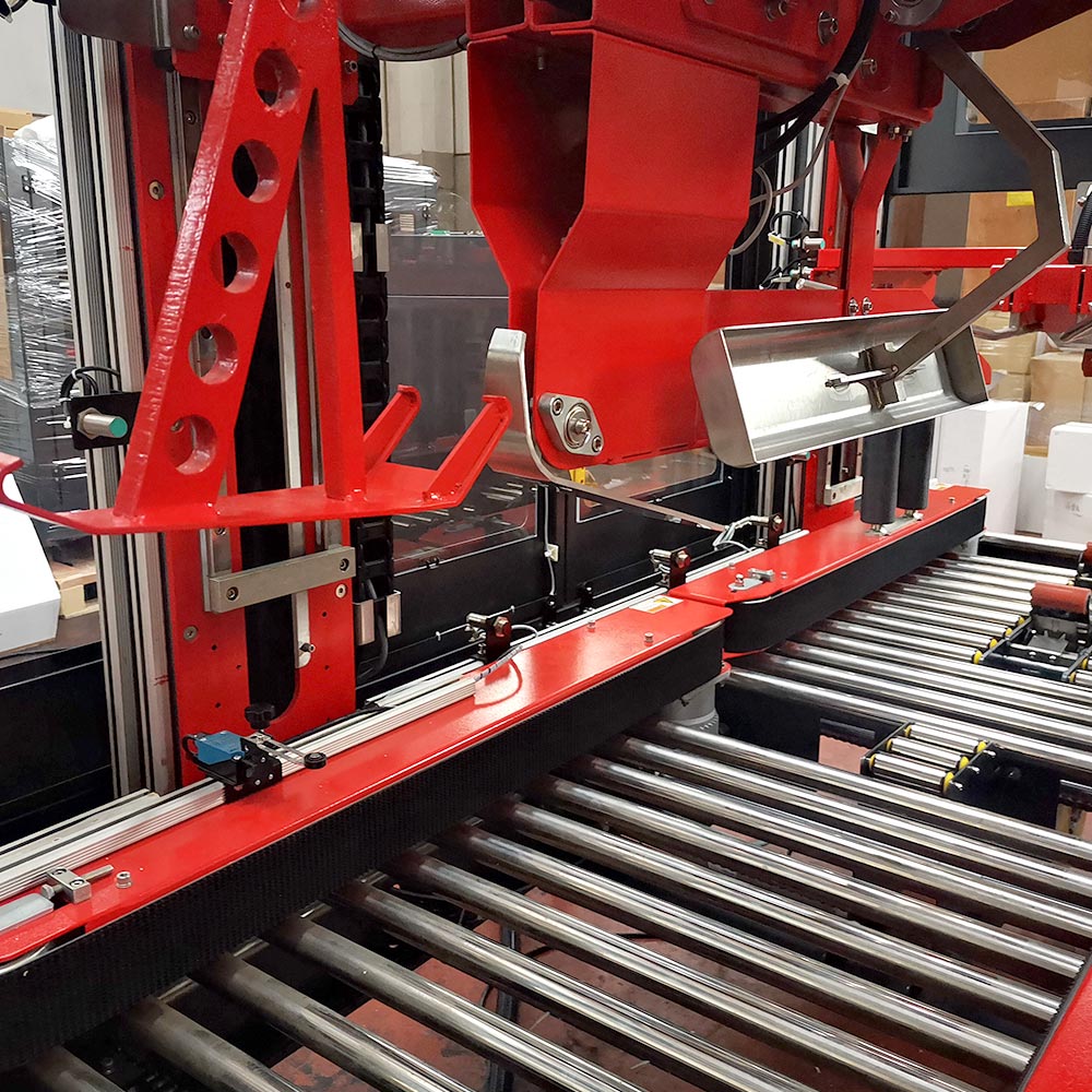 Maszyna jest wyposażona w rolkowe przenośniki wejścia i wyjścia, co umożliwia integrację z zautomatyzowanymi liniami pakującymi.