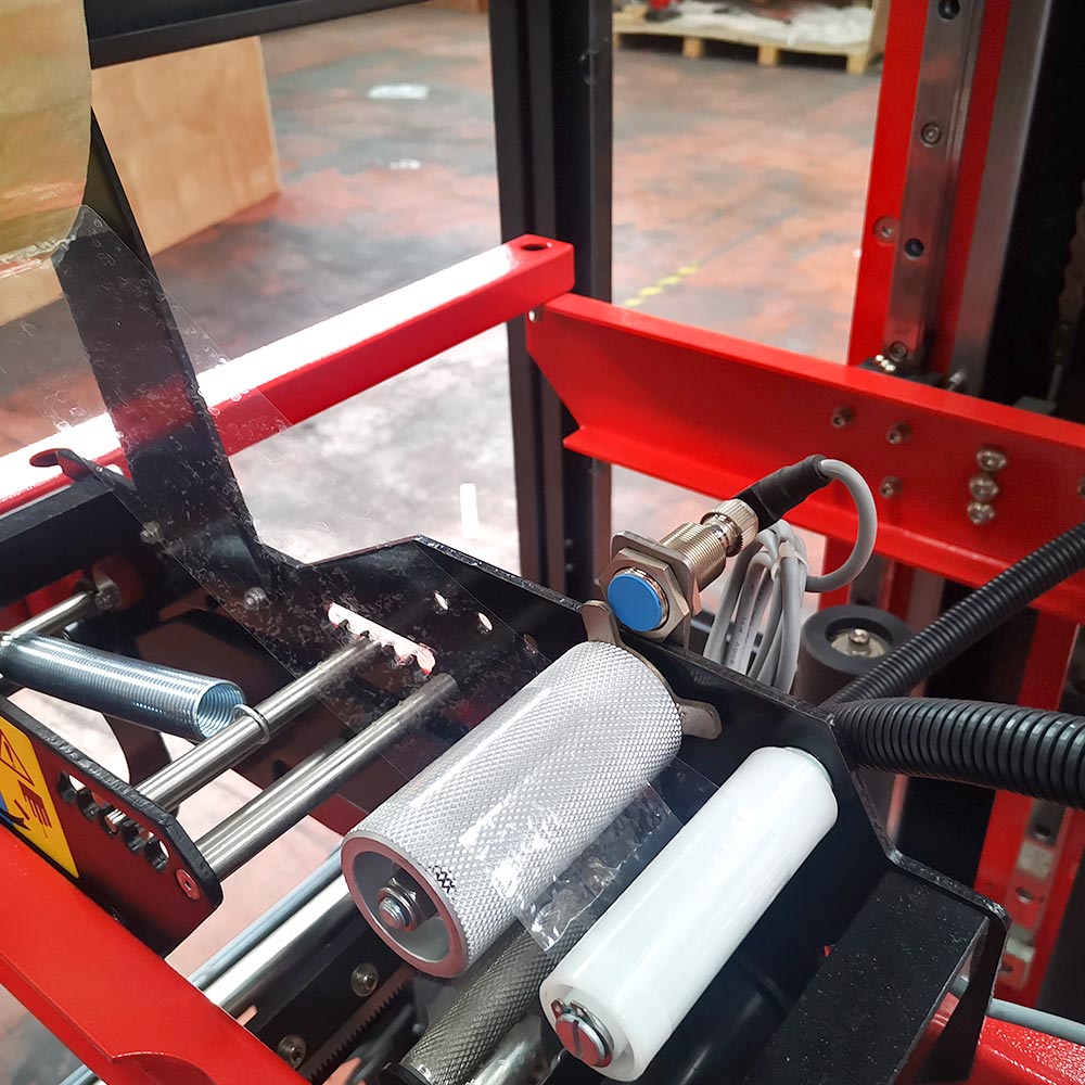 Maszyna jest sterowana elektronicznie za pomocą panelu PLC, co umożliwia zarządzanie funkcjami operacyjnymi oraz nadzór nad czujnikami pracy, a także integrację z innymi urządzeniami linii pakującej. Konstrukcja urządzenia uwzględnia zasady bezpieczeństwa maszyn, a stabilna budowa oraz zastosowane komponenty gwarantują bezpieczną i niezawodną pracę bez nadzoru operatora.