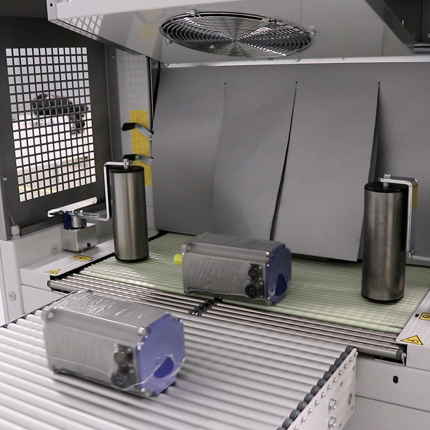 Maszyna realizuje pełny cykl pakowania: zgrzewanie folii wokół produktów oraz obkurczanie jej w tunelu, co zapewnia trwałe i zwarte opakowania gotowe do transportu i magazynowania.