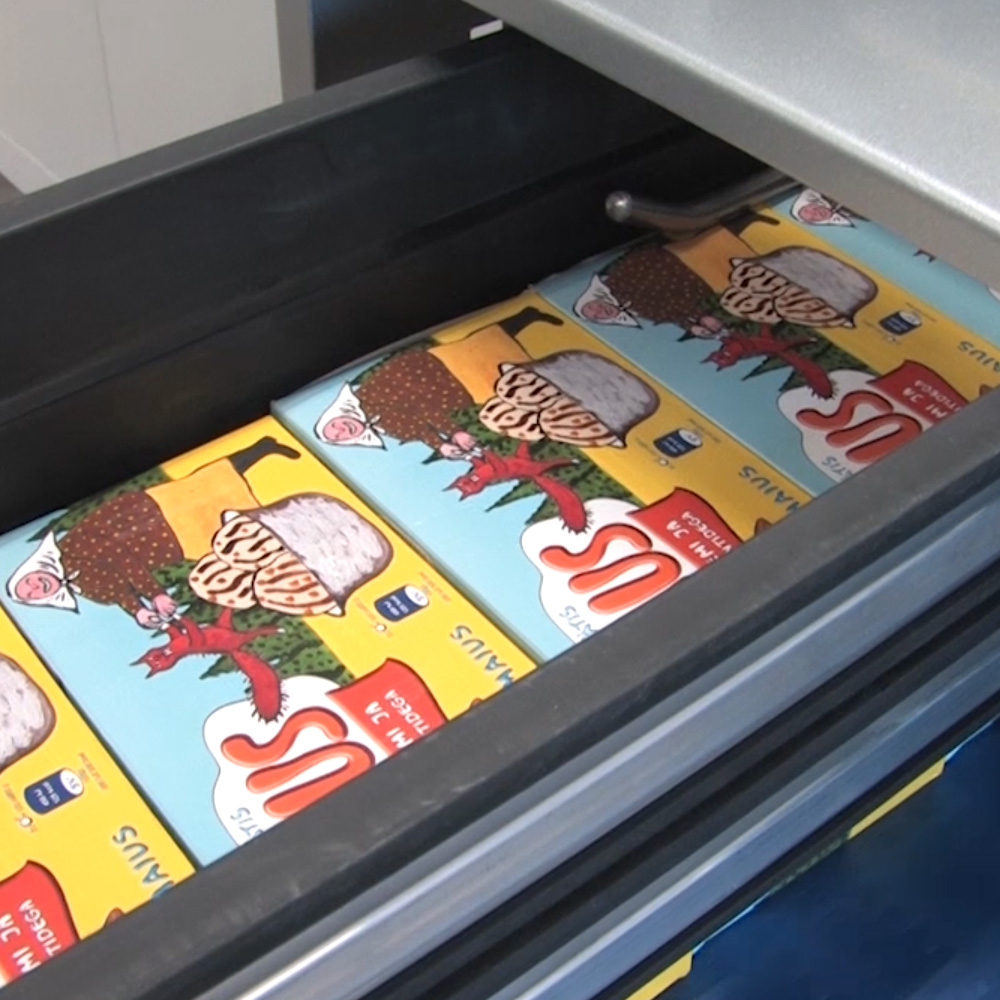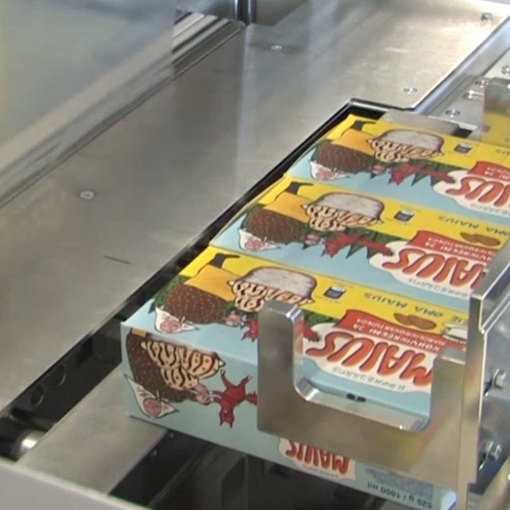 Produkt transportowany jest do strefy pakowania za pomocą przenośnika pod kątem 90°, co umożliwia łatwe połączenie z bocznymi systemami transportowymi. Taka konfiguracja ułatwia integrację z automatami pakującymi i logistycznymi systemami magazynowymi. Fotokomórki obecności oraz system prowadnic pneumatycznych zapewniają precyzyjne podawanie oraz stabilizację produktu w miejscu pakowania.