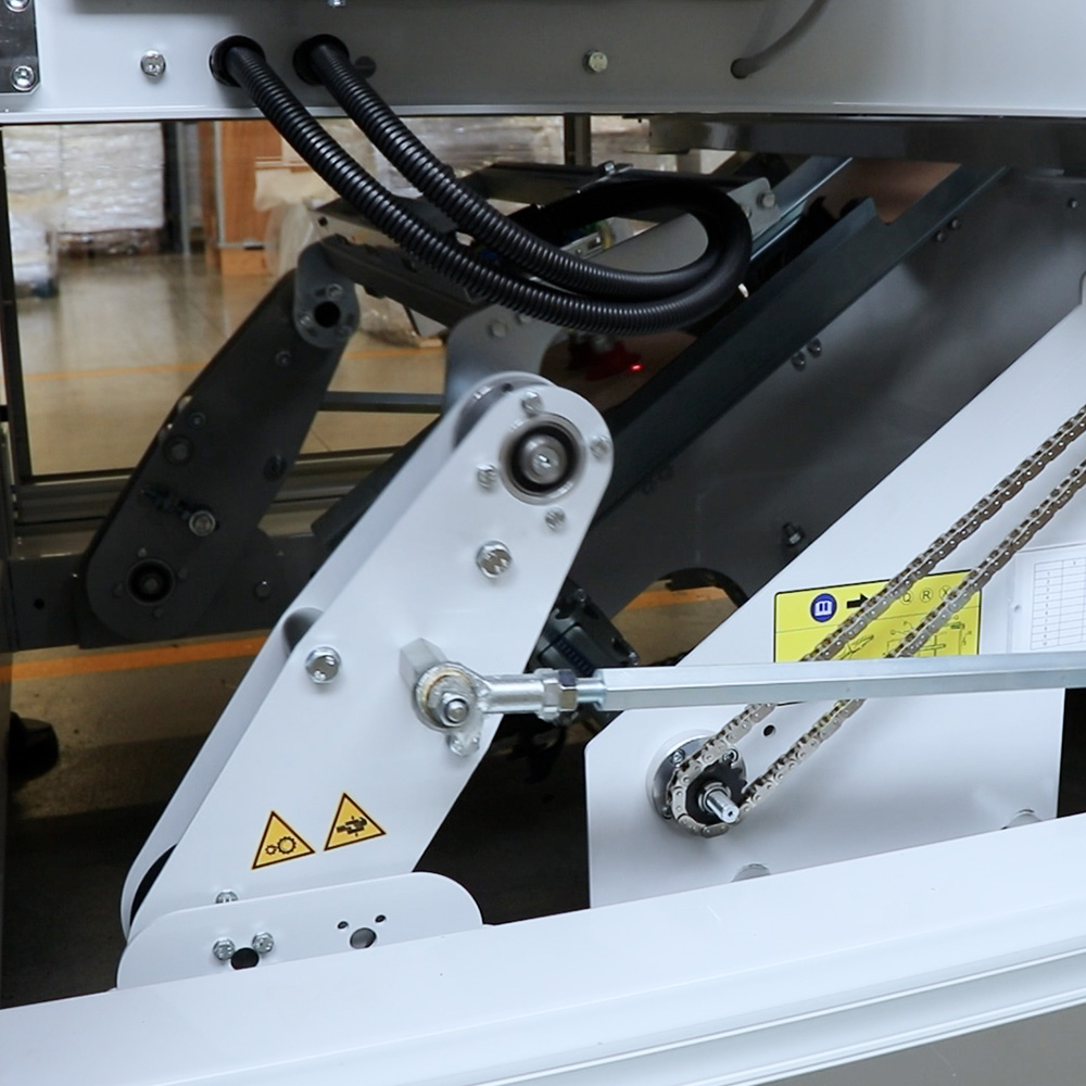 Maszyna jest wyposażona w liczne elementy pneumatyczne i mechaniczne usprawniające proces pakowania, takie jak stabilizatory produktu, pneumatyczne prowadnice boczne oraz systemy popychaczy synchronicznych. Rozwiązania te wspierają płynne prowadzenie produktów przez strefę zgrzewania i obkurczania, co minimalizuje ryzyko powstawania błędów pakowania.