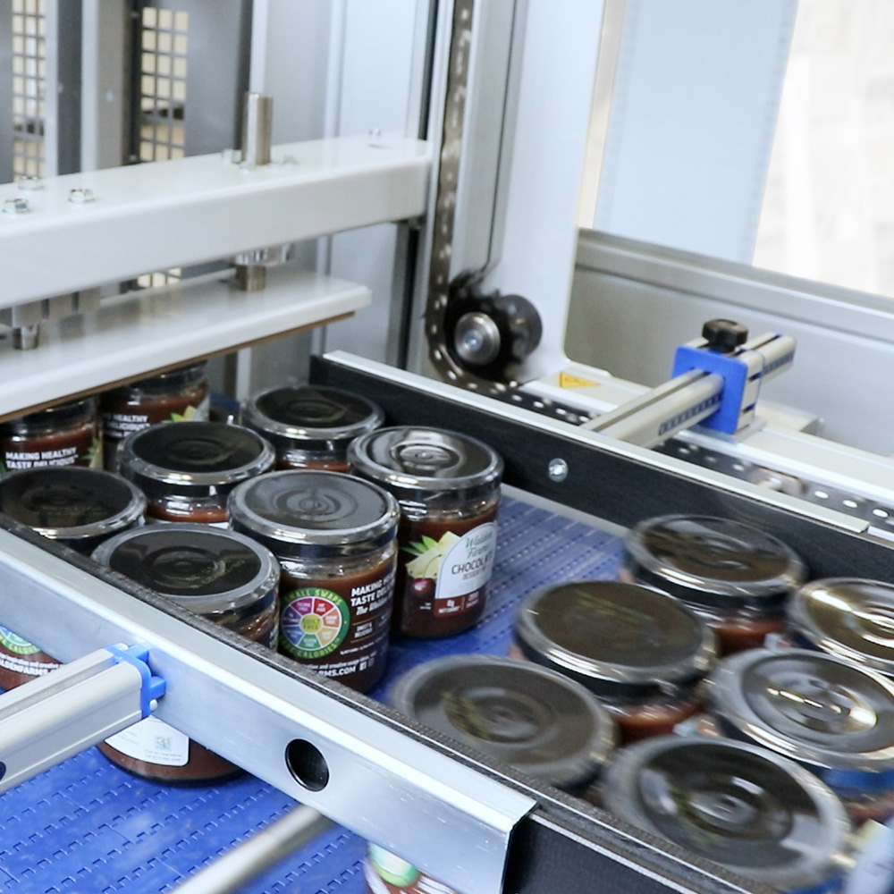 Listwa zgrzewająca o szerokości 760 mm oraz motoryzowane rozwijaki folii górne i dolne sterowane falownikami zapewniają precyzyjne prowadzenie folii. To z kolei wpływa bezpośrednio na jakość zgrzewów i estetykę pakowanych produktów. System sterowania umożliwia regulację prędkości taśmy podawczej oraz parametrów tunelu obkurczającego, co pozwala dopasować cykl pracy do specyfiki pakowanych produktów i rodzaju folii.