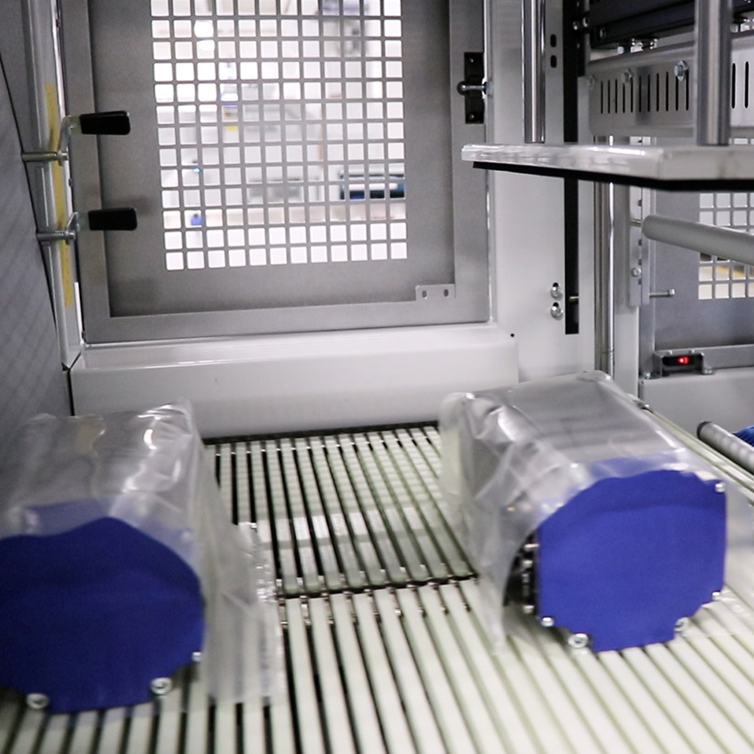 Produkt wprowadzany jest na przenośnik, który prowadzi go pod listwę zgrzewającą o szerokości 760 mm. Folia termokurczliwa prowadzona jest przez motoryzowane szpule górne i dolne, a następnie następuje zgrzewanie i cięcie folii. Po zgrzaniu pakiet przechodzi przez tunel dwukomorowy, w którym folia ulega równomiernemu obkurczeniu, dopasowując się do kształtu ładunku. System fotokomórek umożliwia precyzyjne wykrycie długości pakowanych produktów i ich położenia, co optymalizuje cykl pracy i zmniejsza zużycie folii.