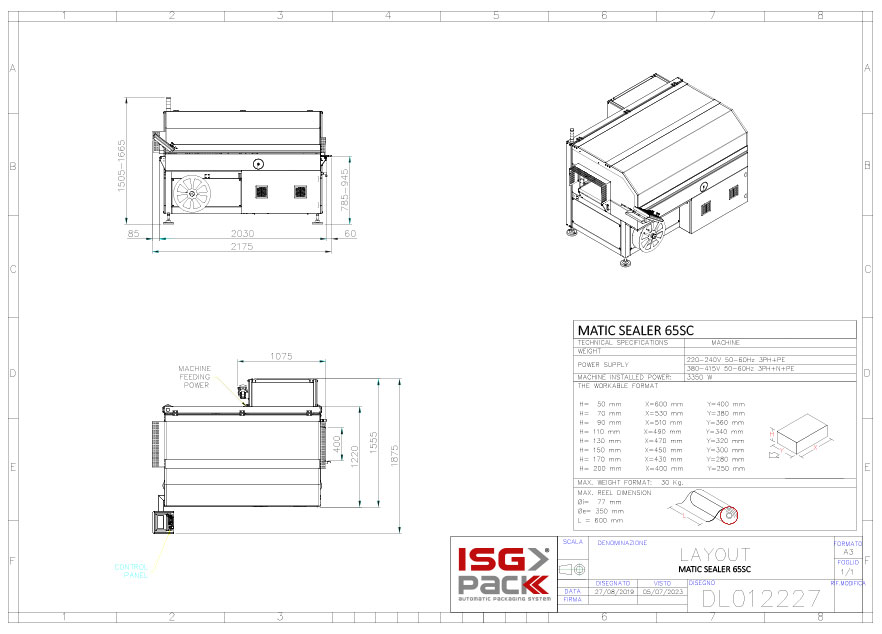 Automatyczna zgrzewarka kątowa Matic Sealer 65 SC to przemysłowe urządzenie pakujące zaprojektowane do realizacji kompletnego procesu pakowania produktów w folie termokurczliwe, takie jak poliolefiny oraz polietylen. Maszyna przeznaczona jest do zastosowań o dużej intensywności pracy, gdzie wymagana jest wysoka wydajność oraz powtarzalność procesu pakowania. Urządzenie realizuje automatyczny cykl obejmujący podawanie produktu do przestrzeni roboczej, rozwijanie i formowanie folii wokół produktu, wykonanie zgrzewu kątowego oraz automatyczne odprowadzenie gotowego pakunku, co eliminuje udział operatora w większości etapów. Konstrukcja urządzenia pozwala na pracę zarówno w konfiguracji z tunelem obkurczającym, jak i samodzielnie, w zależności od potrzeb linii pakującej. Obszar roboczy zgrzewarki umożliwia obsługę produktów o maksymalnej wysokości do 200 mm oraz materiałów foliowych o szerokości do 600 mm.