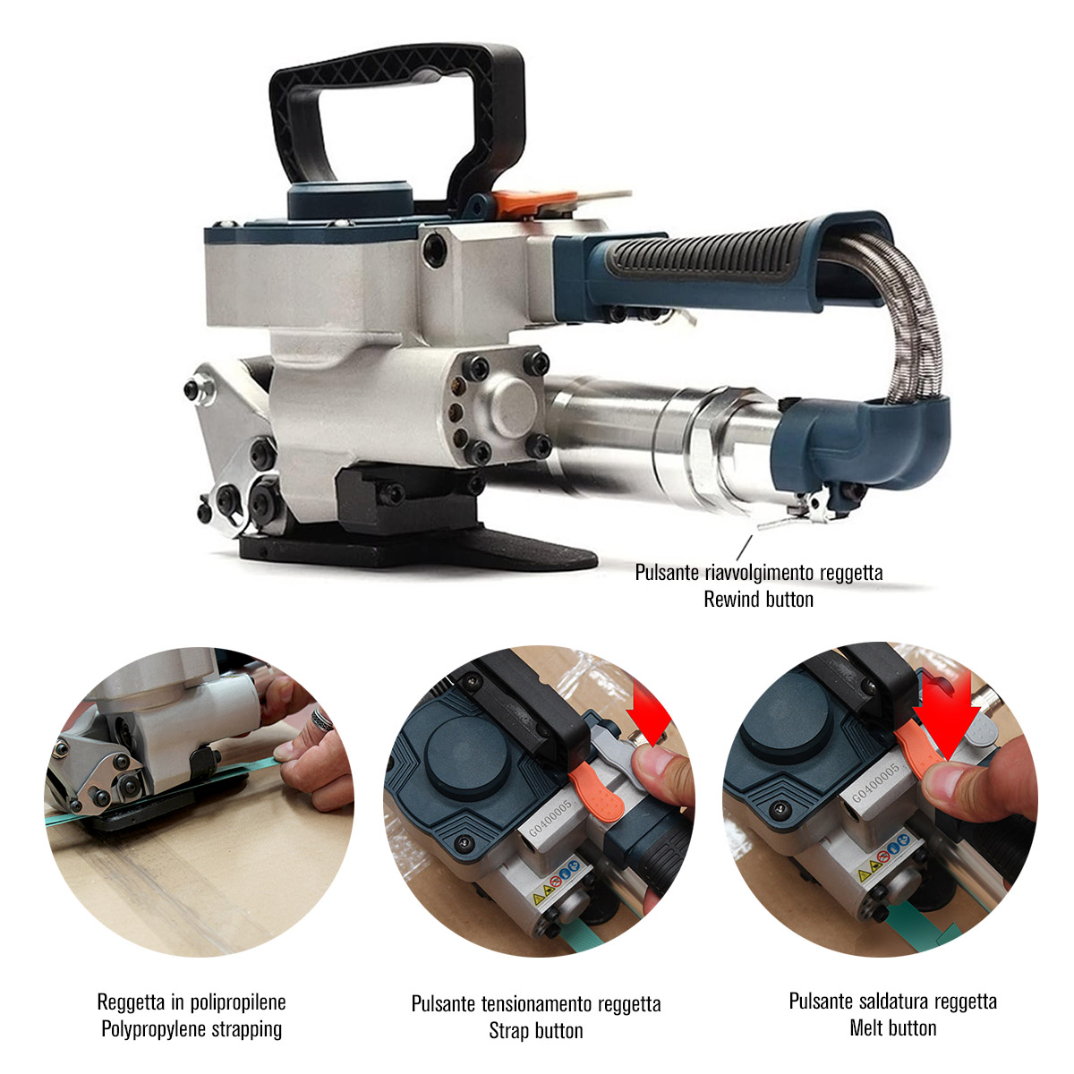 Wyrzut taśmy po zakończeniu cyklu umożliwia łatwe wyjęcie narzędzia z miejsca pracy i przygotowanie go do kolejnego cyklu. Cały proces – napinanie, zgrzewanie, wyrzut – jest powtarzalny, co zapewnia jednolitą jakość spoiny na wszystkich spinanych pakietach.