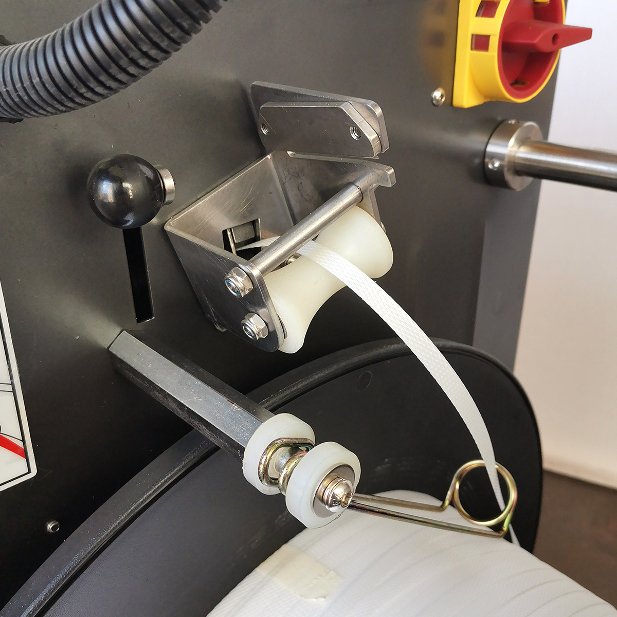 Urządzenie obsługuje standardowe rolki taśmy PP o średnicy wewnętrznej 200 mm i zewnętrznej 400–450 mm oraz grubości 0,45–0,65 mm.