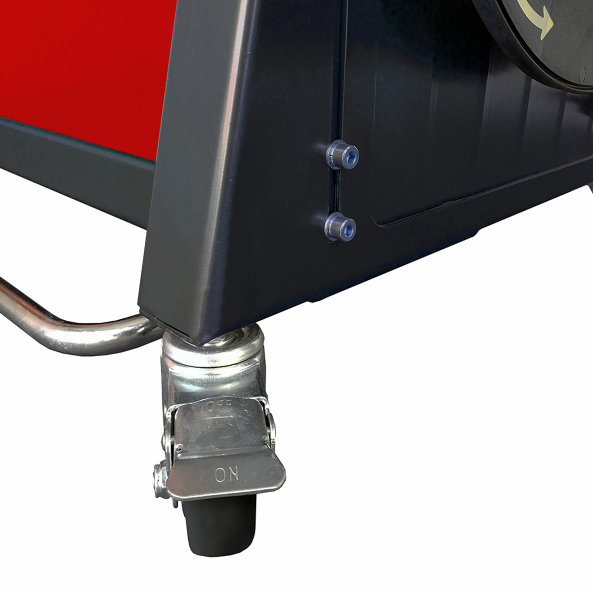 Obrotowe koła z hamulcami ułatwiają stabilne ustawienie maszyny oraz jej łatwe przemieszczanie w hali produkcyjnej.