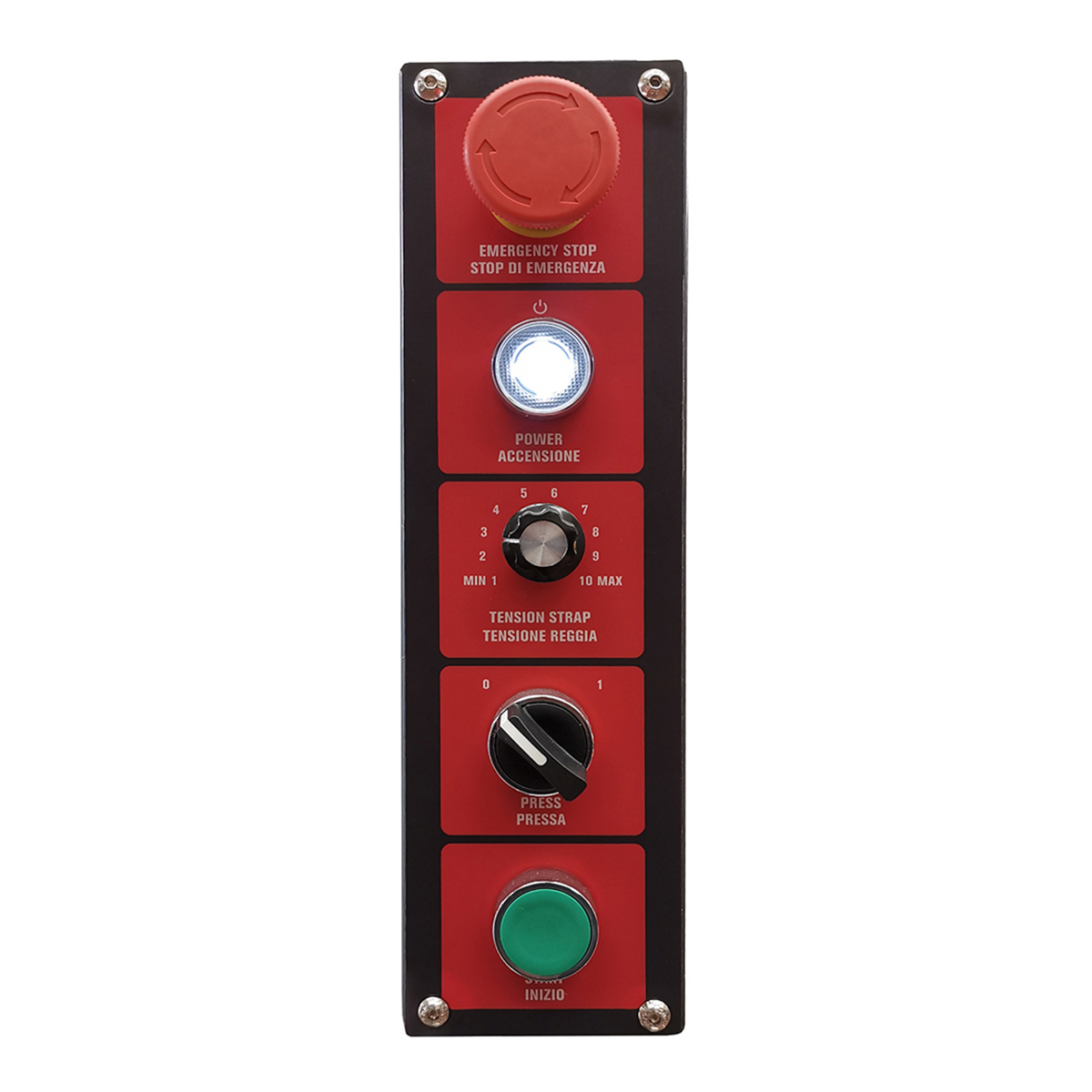 Panel sterowania obraca się, co umożliwia wygodną obsługę z dowolnej strony maszyny, a start cyklu może być uruchamiany pedałem nożnym lub automatycznie po włożeniu paczki do ramy.