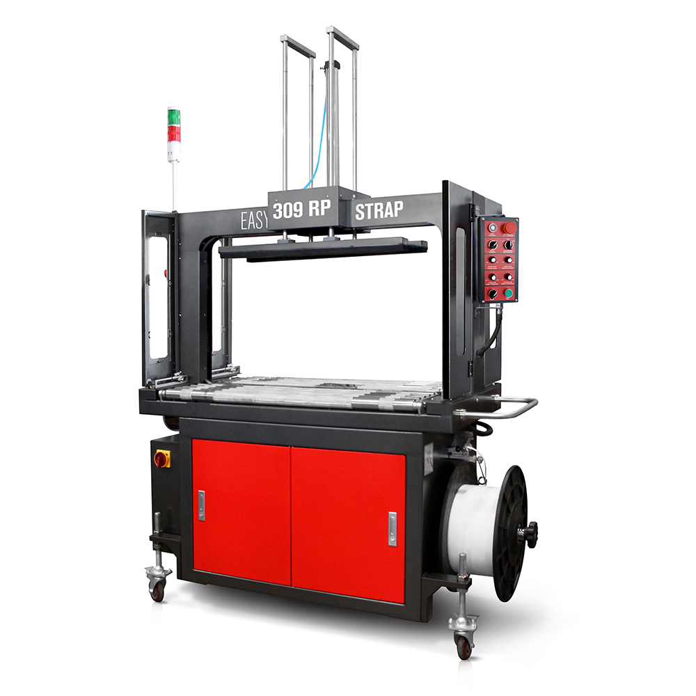 Bandownica ramowa wiązarka PP Easy Strap 309RP/312RP to automatyczna maszyna spinająca paczki taśmą PP o szerokości 9 mm (309RP) lub 12 mm (312RP), wyposażona w prasę dociskową z góry.