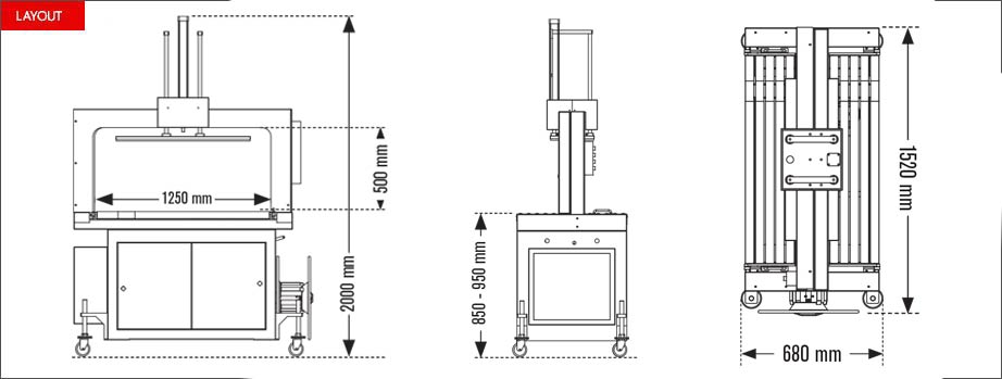 Maszyna jest wyposażona w cztery koła jezdne, z których dwa posiadają hamulce, ułatwiające ustawienie urządzenia w hali produkcyjnej.