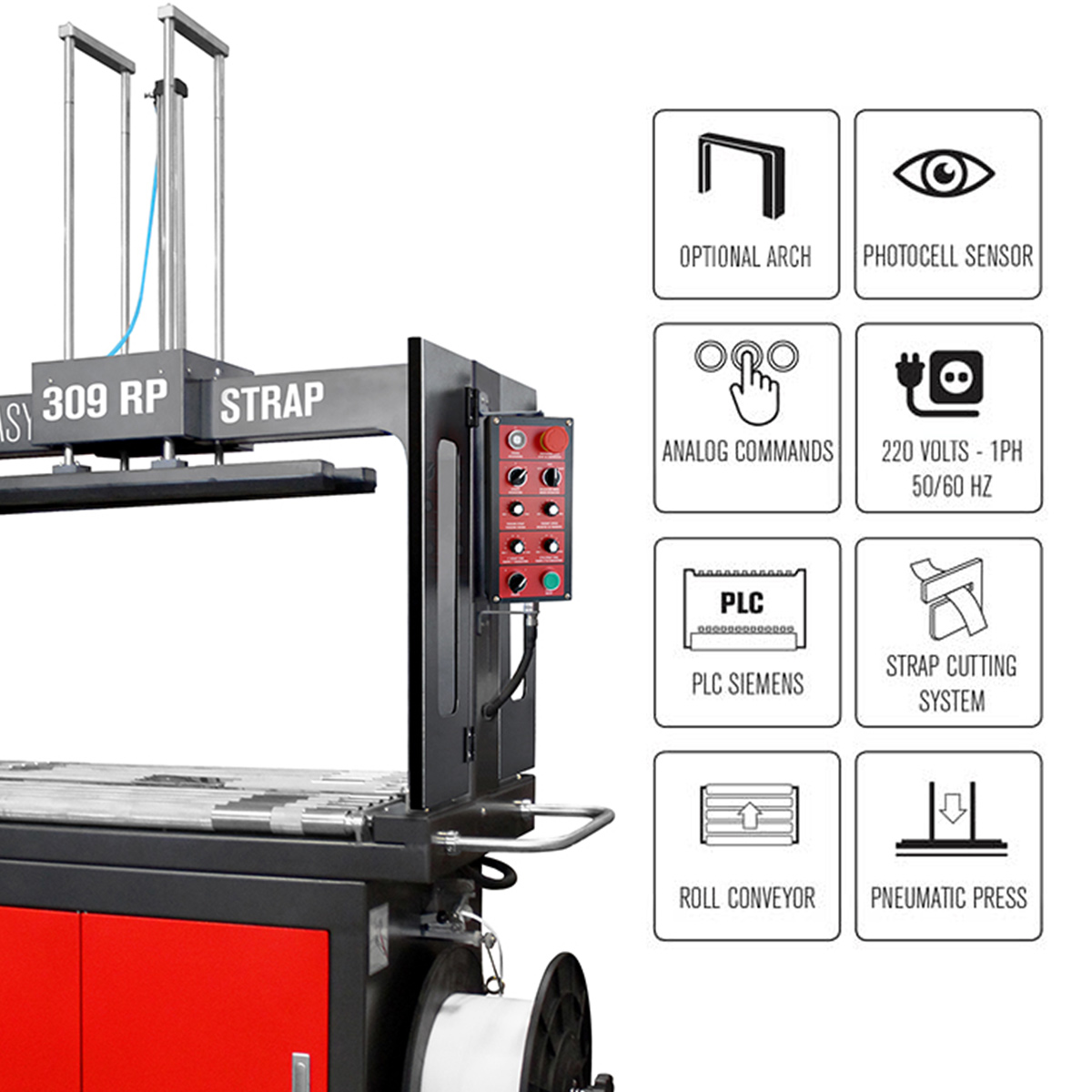 Bandownica ramowa wiązarka PP Easy Strap 309RP/312RP to automatyczna wiązarka do paczek taśmą PP, przeznaczona do integracji z liniami pakującymi, wyposażona w prasę dociskową z góry dla stabilizacji produktu.