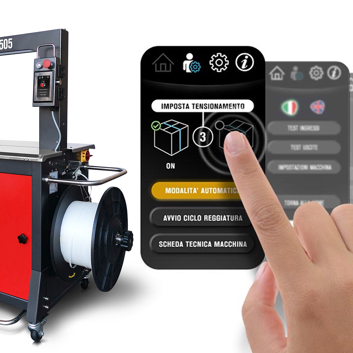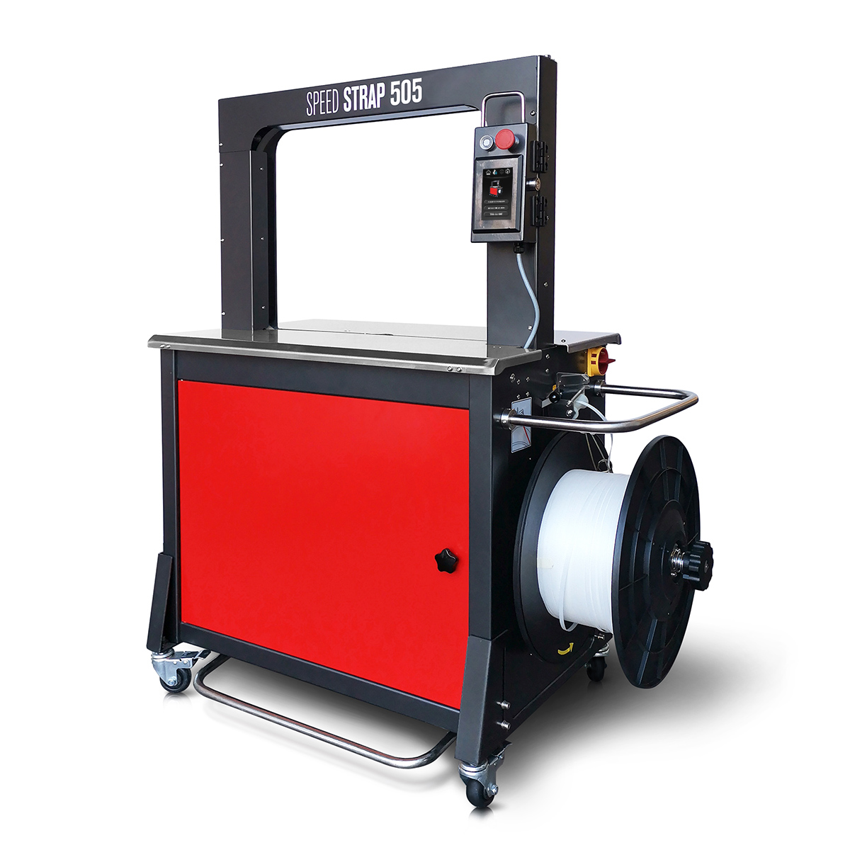 Speed Strap wyposażono w obracany o 180° panel dotykowy oraz pedał nożny, co ułatwia start cyklu i pracę z różnych stron maszyny. To ważne, gdy urządzenie znajduje się w ciągach produkcyjnych lub ciasnych stanowiskach.