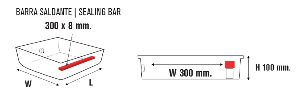 Pakowarka posiada komorę o wymiarach 300 × 300 × 100 mm, co umożliwia umieszczenie opakowań o tych maksymalnych wymiarach wewnątrz urządzenia. W komorze znajduje się jedna listwa zgrzewająca o szerokości 8 mm, która odpowiada za uszczelnianie worków próżniowych po usunięciu powietrza. Cała konstrukcja została wykonana z materiałów odpornych na wpływy środowiskowe oraz wilgoć, co przekłada się na trwałość i łatwość utrzymania urządzenia w czystości.