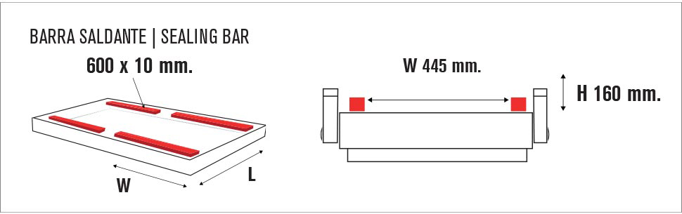 Wyposażona jest w cztery listwy zgrzewające o długości 600 mm, które zapewniają szczelne zamykanie worków po usunięciu powietrza z komory.