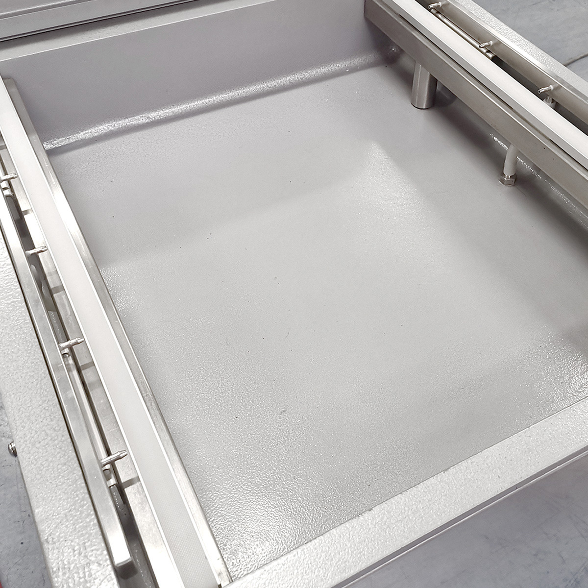 Pakowarka posiada komorę z przesuwaną pokrywą, co ułatwia umieszczanie worków z produktami i ergonomię pracy operatora. Cztery listwy zgrzewające o długości 600 mm umożliwiają szczelne zamykanie worków próżniowych po usunięciu powietrza z komory. Pompa próżniowa o wydajności 63 m³/h zapewnia szybkie osiągnięcie zadanej próżni, co skraca czas cyklu i zwiększa wydajność produkcyjną.