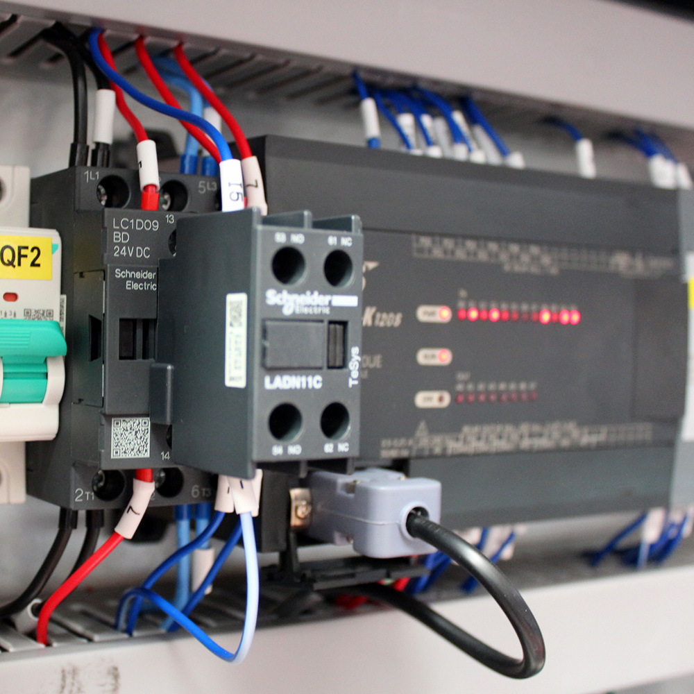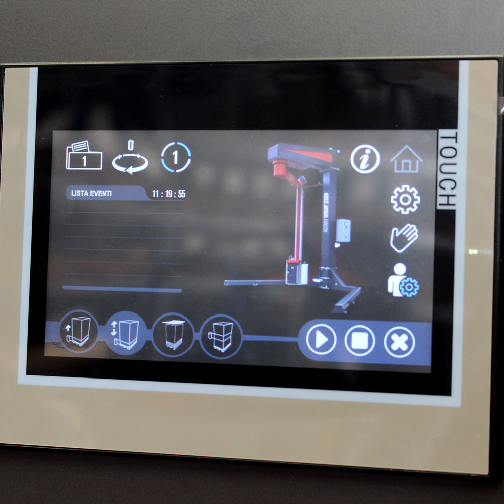 Maszyna jest sterowana poprzez zaawansowany sterownik PLC z kolorowym ekranem dotykowym o przekątnej 7,2″. Interfejs panelu umożliwia operatorowi precyzyjną konfigurację parametrów pracy, takich jak prędkość obrotu ramienia, liczba cykli, prędkość wózka podnoszącego folię oraz wysokość owijania. Panel sterowania pozwala także na zapis i przywołanie programów owijania dostosowanych do różnych typów produktów, co skraca czas konfiguracji i zwiększa powtarzalność procesu.