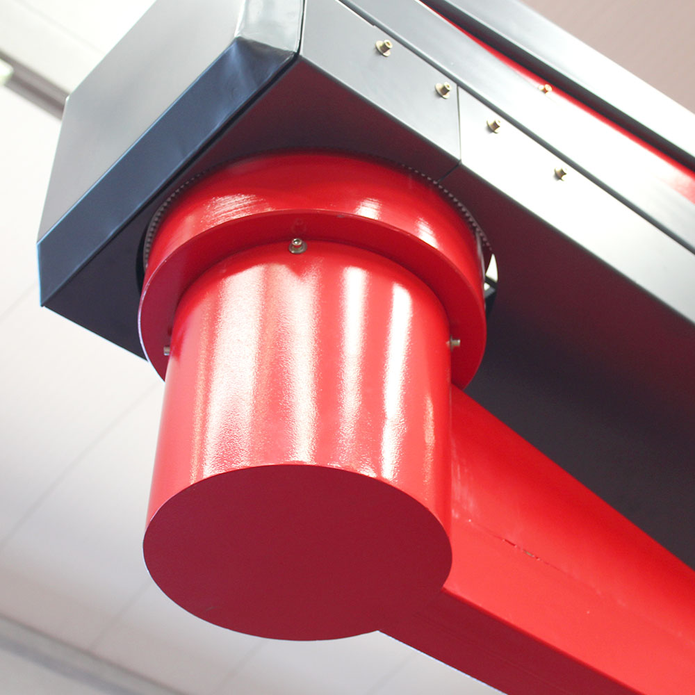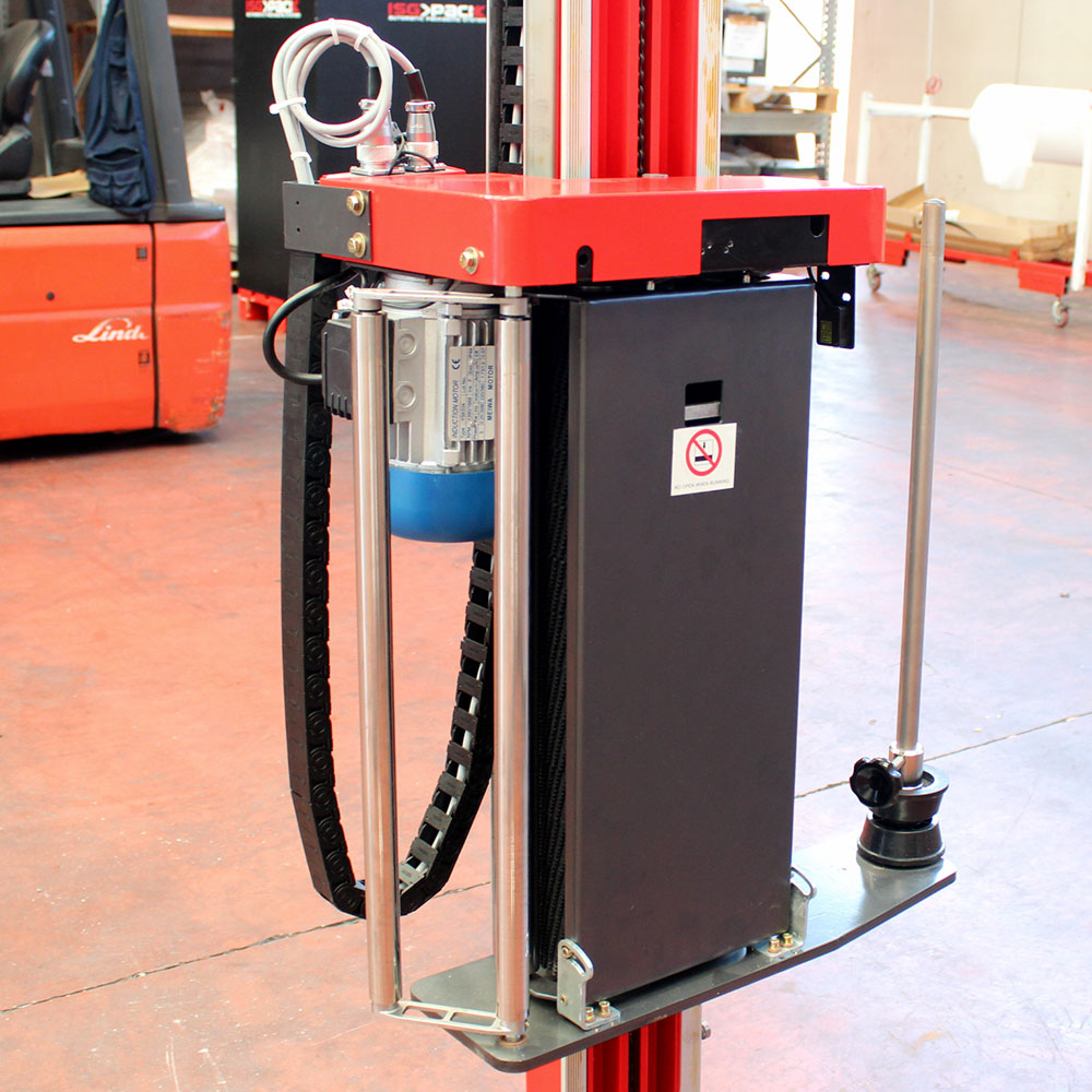 Ramię w modelu 2300 B ma maksymalną prędkość obrotową do 15 obrotów na minutę, którą można regulować za pomocą panelu sterowania. Mechanizm obrotu jest napędzany poprzez falownik, co pozwala na płynne przyspieszanie i zatrzymywanie, minimalizując wstrząsy podczas cyklu pakowania. Ramię obraca się wokół palety na średnicy 2000 mm, zapewniając równomierne nałożenie folii na całej wysokości ładunku.