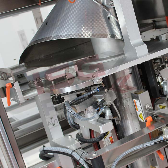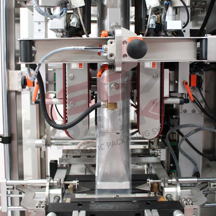 Pionowa maszyna pakująca Matic Vert 520 CS CP 4H to automatyczne urządzenie do pakowania produktów metodą zgrzewania przerywanego. Konstrukcja wykonana jest ze stali nierdzewnej, co ułatwia czyszczenie i konserwację. Maszyna sterowana jest przemysłowym PLC i wyposażona w cztery serwomotory do synchronizacji ruchu. System formowania folii umożliwia regulację wymiarów opakowania. Maszyna pracuje przy zasilaniu 380 V i ciśnieniu powietrza 0,5 MPa.
