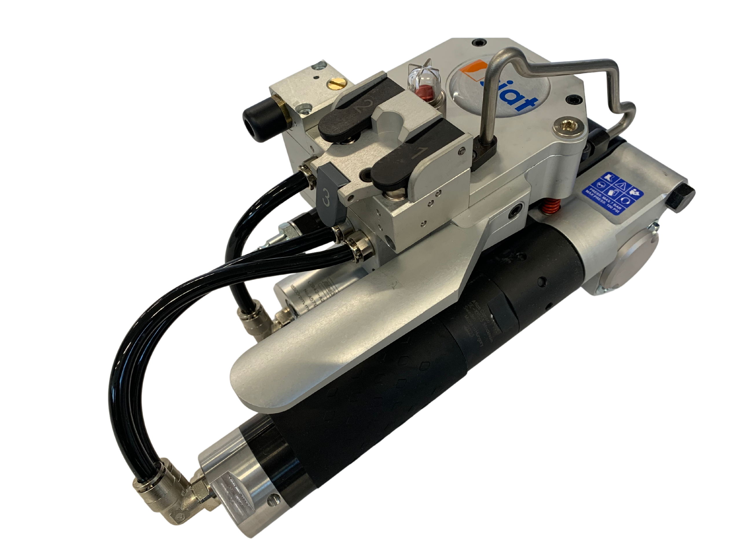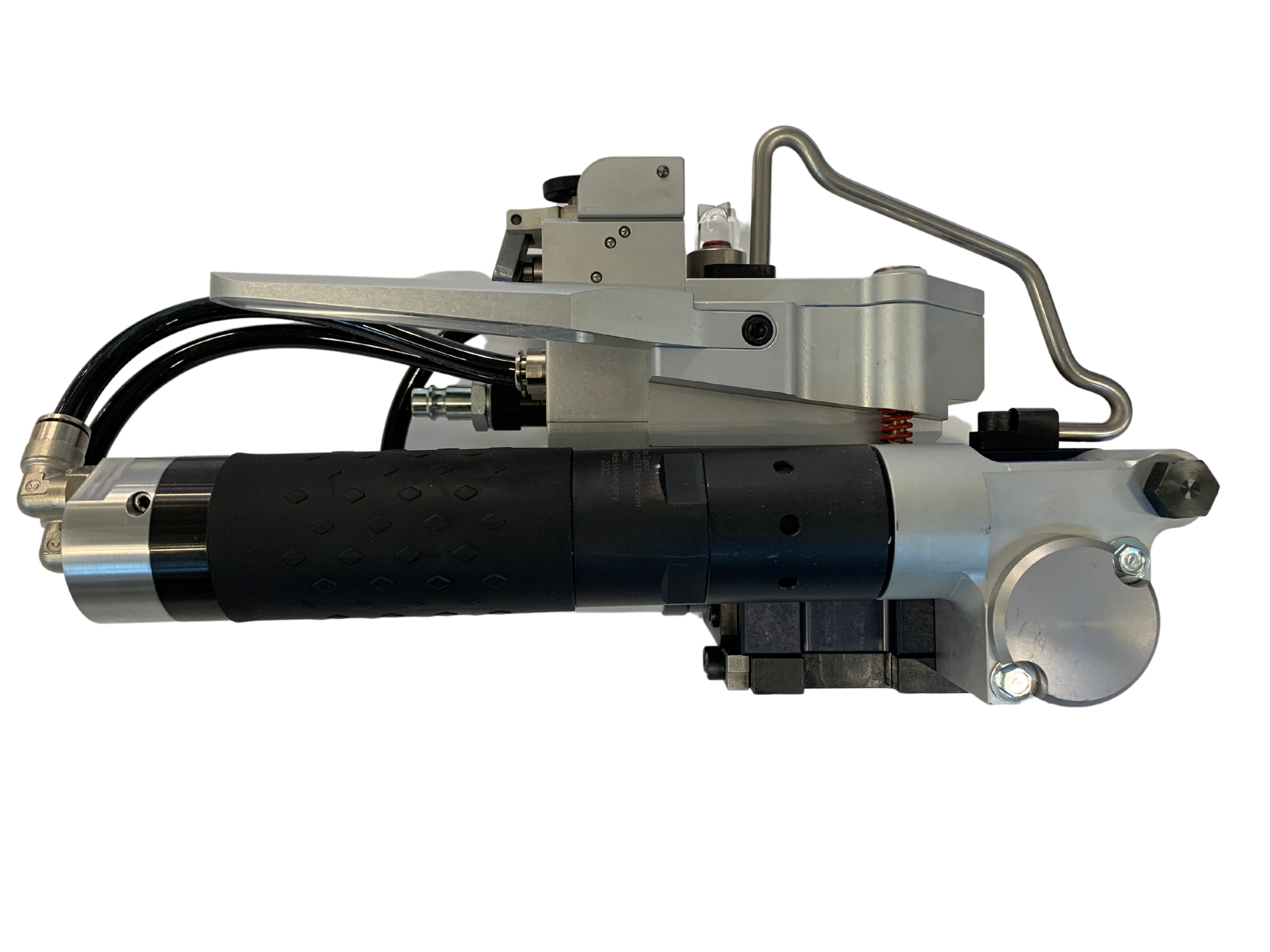 Urządzenie zapewnia stabilną i powtarzalną pracę dzięki napędowi pneumatycznemu współpracującemu z ciśnieniem roboczym 6–7 bar. Maksymalna siła naciągu sięga do 6 500 N, co umożliwia skuteczne spinanie ciężkich pakunków i elementów konstrukcyjnych. Prędkość naciągu taśmy wynosi około 4,5 m/min, co pozwala na sprawne i powtarzalne wykonywanie cykli wiązania przy dużym natężeniu pracy. Zastosowanie zgrzewu tarciowego gwarantuje trwałe i jednolite połączenia, odporne na rozciąganie oraz obciążenia dynamiczne, co jest kluczowe przy transporcie i magazynowaniu. Konstrukcja narzędzia pozwala na efektywne wykorzystanie taśm PET o większych szerokościach, zapewniając stabilność i bezpieczeństwo spinanych ładunków.