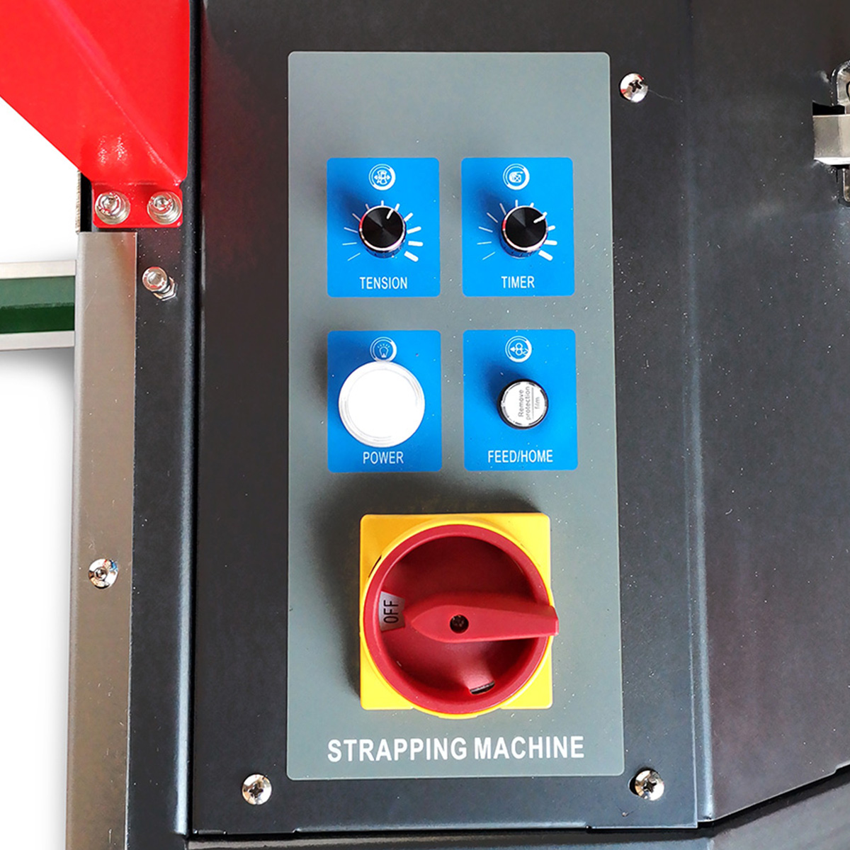 Urządzenie wyposażone jest w silniki prądu stałego sterujące poszczególnymi funkcjami bandowania, co zapewnia płynność i powtarzalność działania. Elektroniczna regulacja siły napinania taśmy odbywa się za pomocą potencjometru umieszczonego na panelu sterowania, co umożliwia dostosowanie naprężenia do rodzaju i wymiarów spinanego ładunku. Regulacja temperatury ostrza zgrzewającego, czasu chłodzenia (COOL TIME) oraz długości odcinka taśmy do wydania są również realizowane z poziomu panelu sterowania, co pozwala na precyzyjne dopasowanie parametrów procesu spinania.