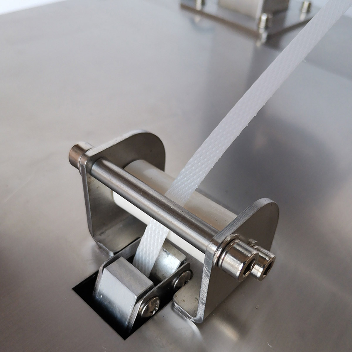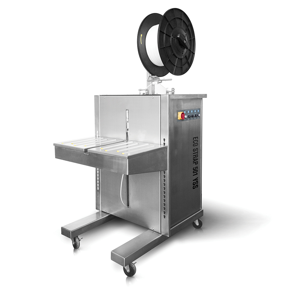 Półautomatyczna bandownica stołowa Eco Strap 501 YSS jest urządzeniem zaprojektowanym do spinania opakowań taśmą polipropylenową PP o szerokościach 6 mm, 9 mm, 12 mm i 15 mm. Konstrukcja korpusu bandownicy wykonana jest niemal w całości ze stali nierdzewnej **SUS 304**, co pozwala na zastosowanie urządzenia w branżach wymagających odporności na korozję, wilgoć i czyszczenie częstym wodą, takich jak przemysł spożywczy, rybny, mięsny oraz przetwórstwo produktów rolno-spożywczych. Blat roboczy maszyny wyposażono w wałki obrotowe i czujnik bezpieczeństwa, który aktywuje cykl spinania po prawidłowym umieszczeniu pakunku na powierzchni roboczej. Urządzenie realizuje kolejno cykl napinania, zgrzewania i obcinania taśmy, zapewniając powtarzalne i stabilne wiązania.