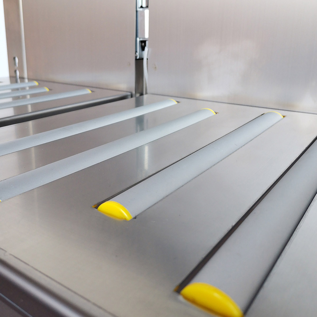 Blat roboczy bandownicy ma regulowaną wysokość, co ułatwia dopasowanie stanowiska pracy do operatora oraz charakterystyki spinanych opakowań, co wpływa na ergonomię pracy. Cztery obrotowe koła, z czego dwa wyposażone są w hamulce, ułatwiają przemieszczanie bandownicy oraz jej stabilne ustawienie w miejscu pracy. Konstrukcja bandownicy z boczną głowicą spinającą oraz wysokim położeniem portabobiny ogranicza narażenie taśmy na kontakt z wilgocią lub produktami, co zwiększa niezawodność pracy w środowiskach wilgotnych i trudnych warunkach.