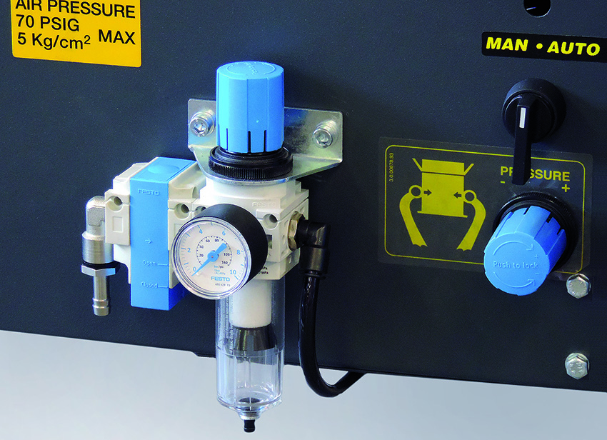 Urządzenie zostało zaprojektowane i wykonane zgodnie z obowiązującymi standardami bezpieczeństwa maszyn. Zastosowane zabezpieczenia chronią operatora przed niekontrolowanymi ruchami elementów pneumatycznych, a odpowiednie osłony i blokady minimalizują ryzyko urazów.