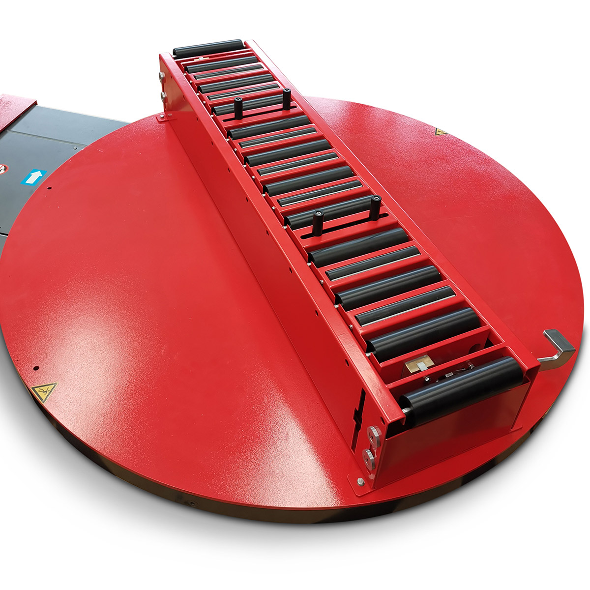 Maszyna posiada solidną ramę i talerz obrotowy o średnicy 1650 mm, który utrzymuje produkty o maksymalnej wysokości 2000 mm i masie do 150 kg. Przenośnik rolkowy z blokadą dolną pozwala stabilnie ustawić produkt przed rozpoczęciem cyklu owijania. Konstrukcja zapewnia bezpieczeństwo podczas pracy i minimalizuje ryzyko przesunięć lub uszkodzeń produktów w trakcie pakowania.