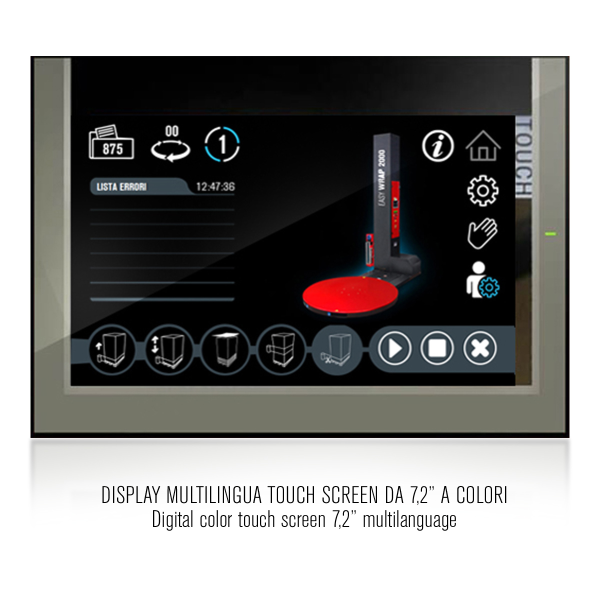 Easy Wrap 2000 A RC wyposażona jest w kolorowy panel dotykowy 7,2″ współpracujący z kontrolerem PLC. Panel umożliwia intuicyjne ustawienie wszystkich parametrów cyklu owijania, takich jak liczba obrotów talerza, prędkość podnoszenia i opuszczania wózka folii, liczba cykli owijania i opóźnienia odczytu fotokomórki. Możliwe jest zapisanie do 10 programów pracy, co pozwala łatwo przełączać ustawienia w zależności od rodzaju palety i folii.