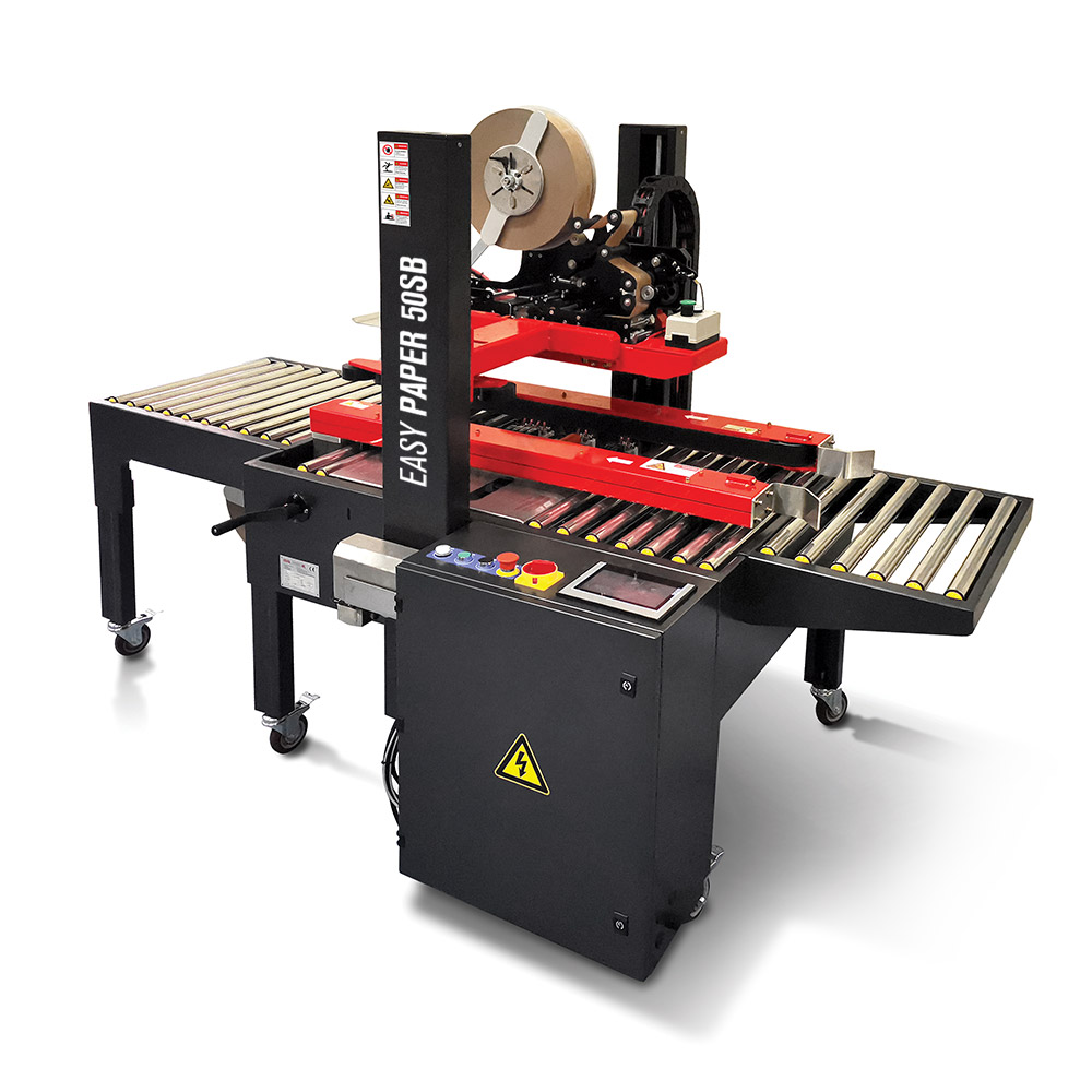 Półautomatyczna zaklejarka Easy Paper 50 SB to maszyna do zamykania kartonów klapowych z użyciem papierowej taśmy klejącej Kraft z włóknami lub bez wzmocnienia.