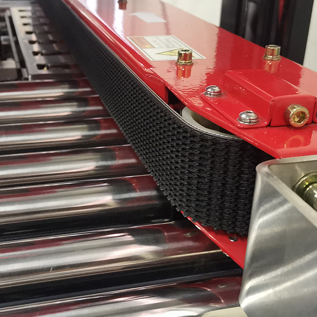 Transport kartonów w maszynie realizowany jest przez dwa napędzane boczne pasy, które zapewniają równomierny i stabilny przesuw opakowań przez strefę klejenia. Napęd pasów jest uruchamiany po detekcji kartonu z użyciem fotokomórki, co ogranicza zużycie energii i redukuje niepotrzebną pracę napędu poza cyklem klejenia. Przenośniki rolkowe ułatwiają podawanie i odbiór kartonów, co usprawnia obsługę urządzenia w środowisku produkcyjnym.