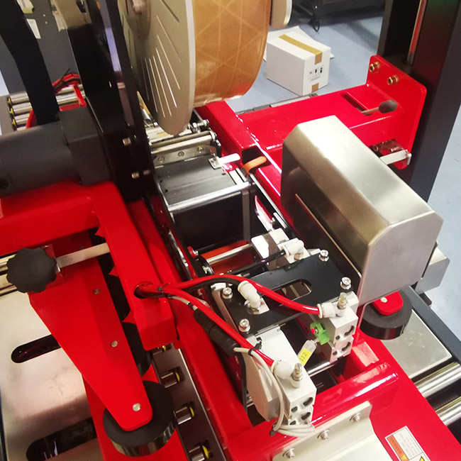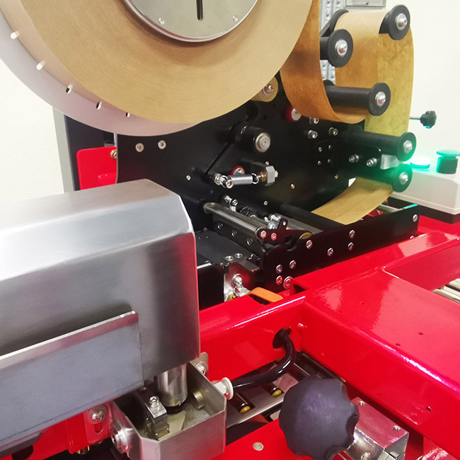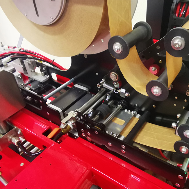 Proces pakowania rozpoczyna się od wprowadzenia kartonu przez operatora do strefy wejściowej. Kiedy karton zostanie zidentyfikowany przez fotokomórkę, boczne pasy chwytają i prowadzą go w kierunku głowic klejących. Taśma papierowa jest wcześniej zwilżana przez specjalne rolki zwilżające, co aktywuje klej na papierze. Następnie gumowe rolki głowic aplikują zwilżoną taśmę papierową na dolnej oraz górnej klapie kartonu, a pneumatyczne systemy wykonują cięcie taśmy po naklejeniu. Tak przygotowane opakowanie uzyskuje trwałe i estetyczne zamknięcie, gotowe do dalszego transportu lub magazynowania.