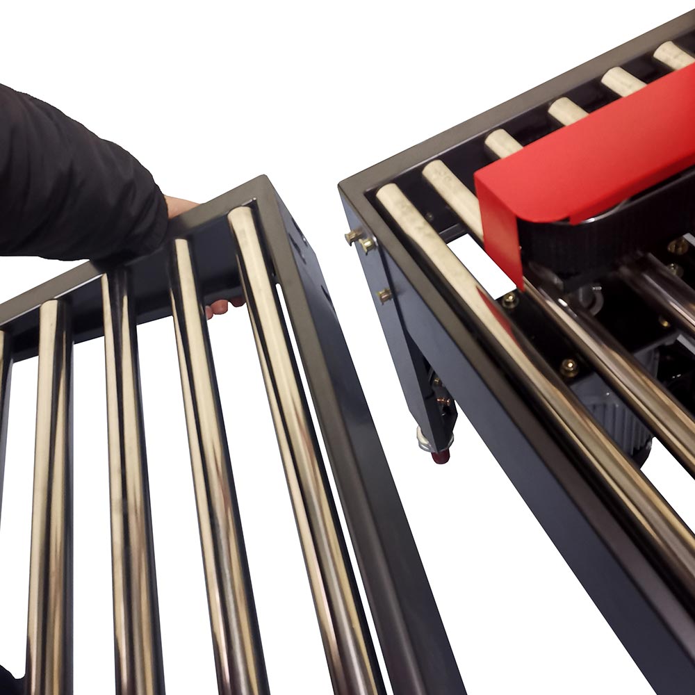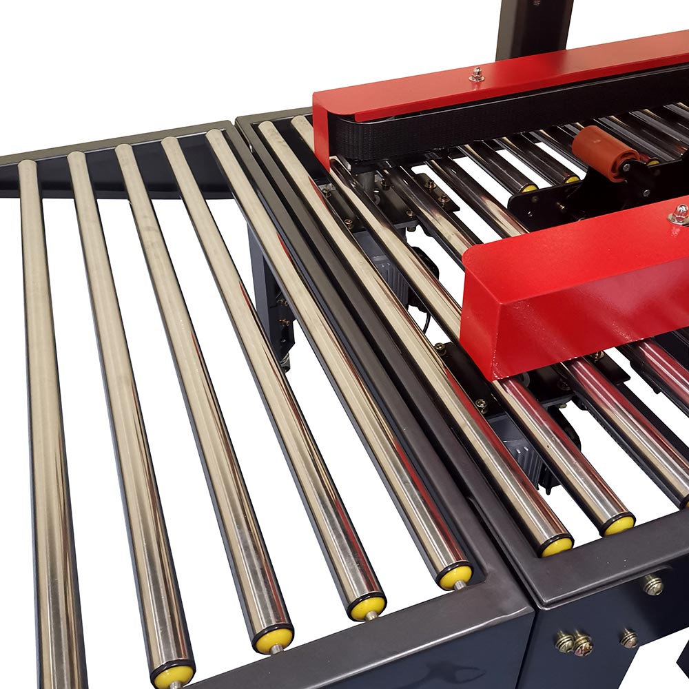 Zaklejarka wyposażona jest w rolkowe przenośniki wejścia i wyjścia oraz system bezpieczeństwa z przyciskiem awaryjnego zatrzymania.