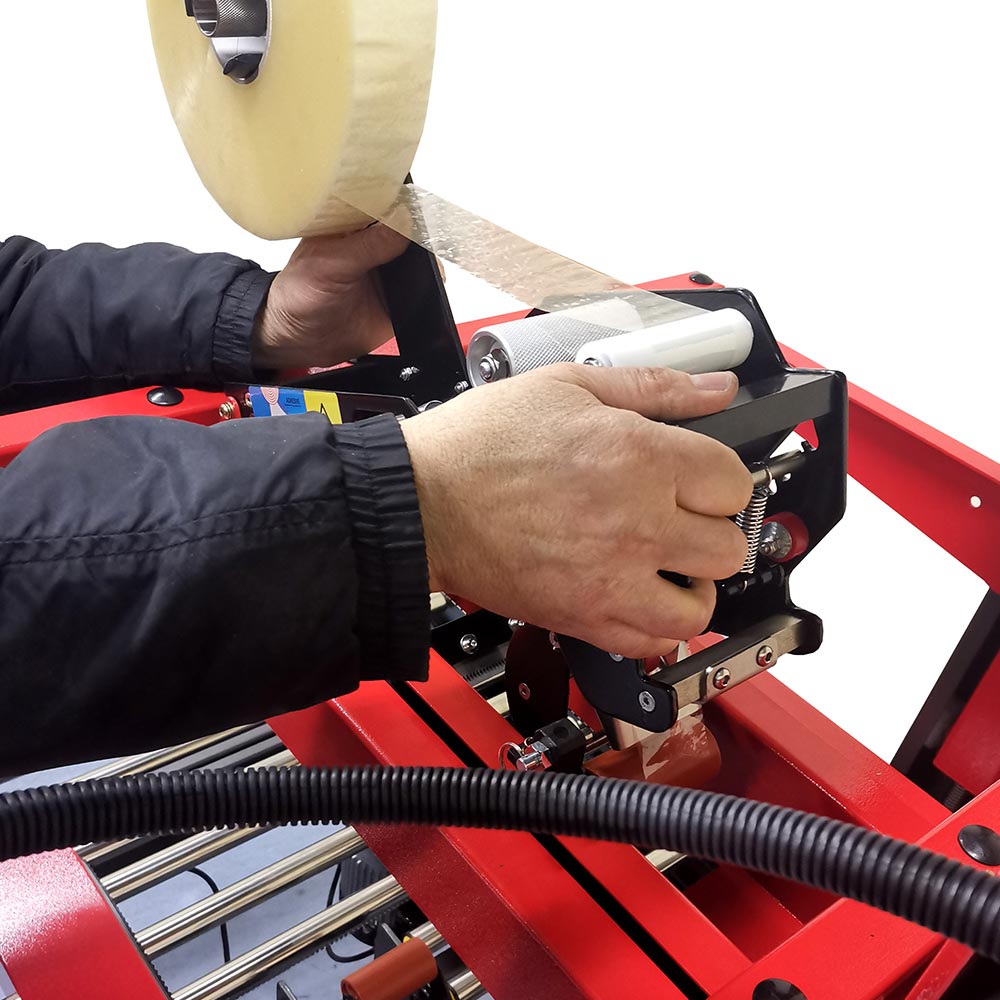 Półautomatyczna zaklejarka Easy Tape 70 TSB to maszyna do zaklejania górnej i dolnej części dużych kartonów klapowych taśmą samoprzylepną.