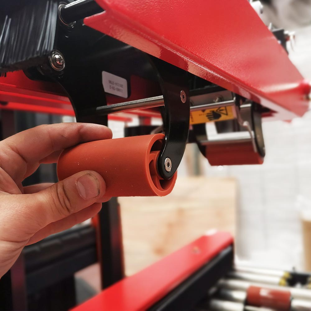 Zaklejarka Easy Tape 70 TSB posiada zestaw napędów składający się z górnych i dolnych pasów trakcyjnych, które prowadzą karton przez strefę zaklejania. Operator wprowadza opakowanie przez rolkowy przenośnik wejściowy, a napęd pasów chwytając karton zapewnia jego równomierny przesuw przez głowice zaklejające. Dzięki zastosowaniu pasów zarówno w górnej, jak i dolnej części urządzenia uzyskuje się stabilne prowadzenie opakowania podczas całego cyklu pakowania.
